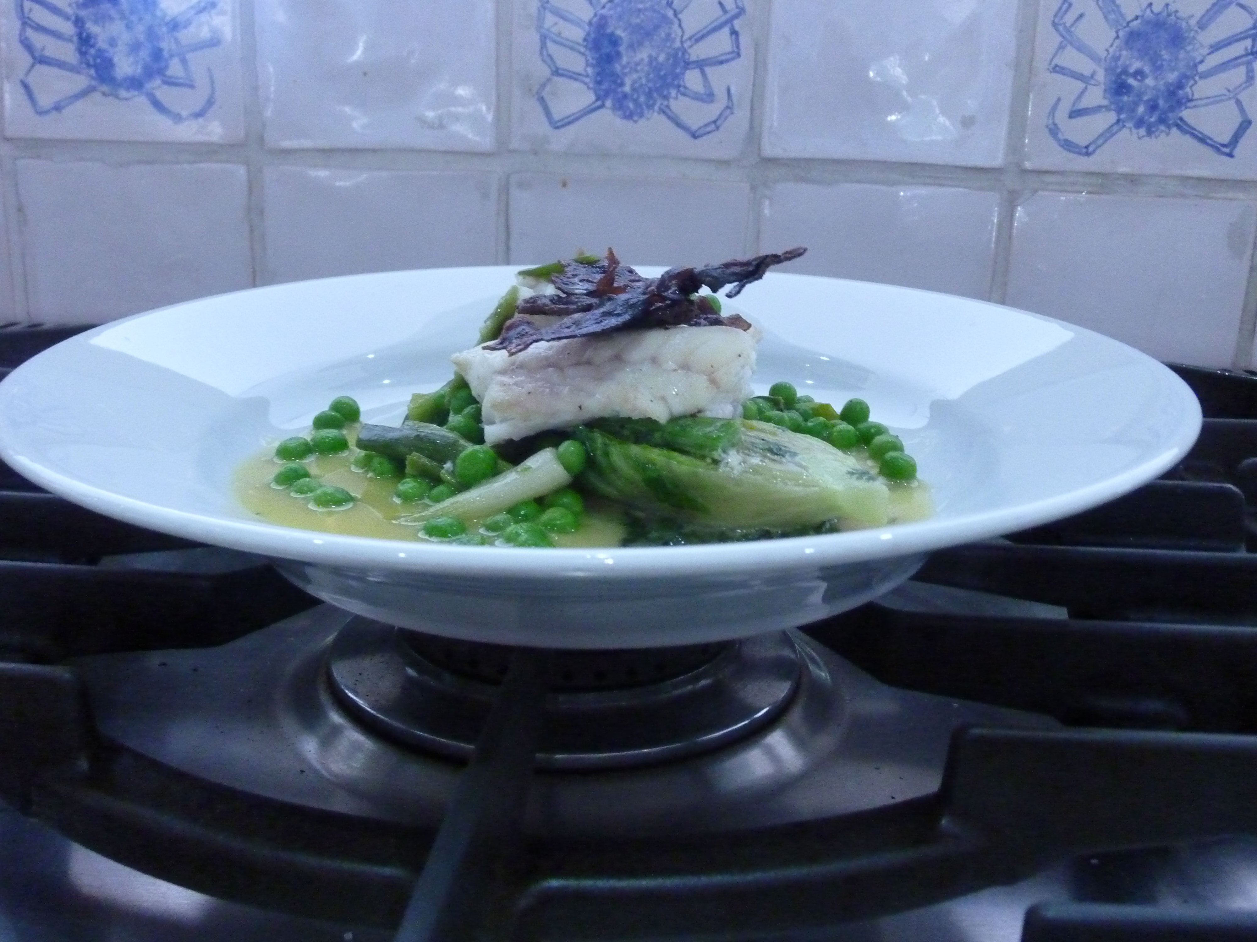 The last thing we cooked was Ling (a cross between a cod and a large eel) with spring onions, gem lettuce hearts and peas. All braised in butter and chicken stock and topped off with some crispy pancetta. Oh wow, I’m practically crying with delight as I describe it! It was so nice. And so simple to make, once, Andy, another of the chefs, had done the hard work filleting the massive ling.