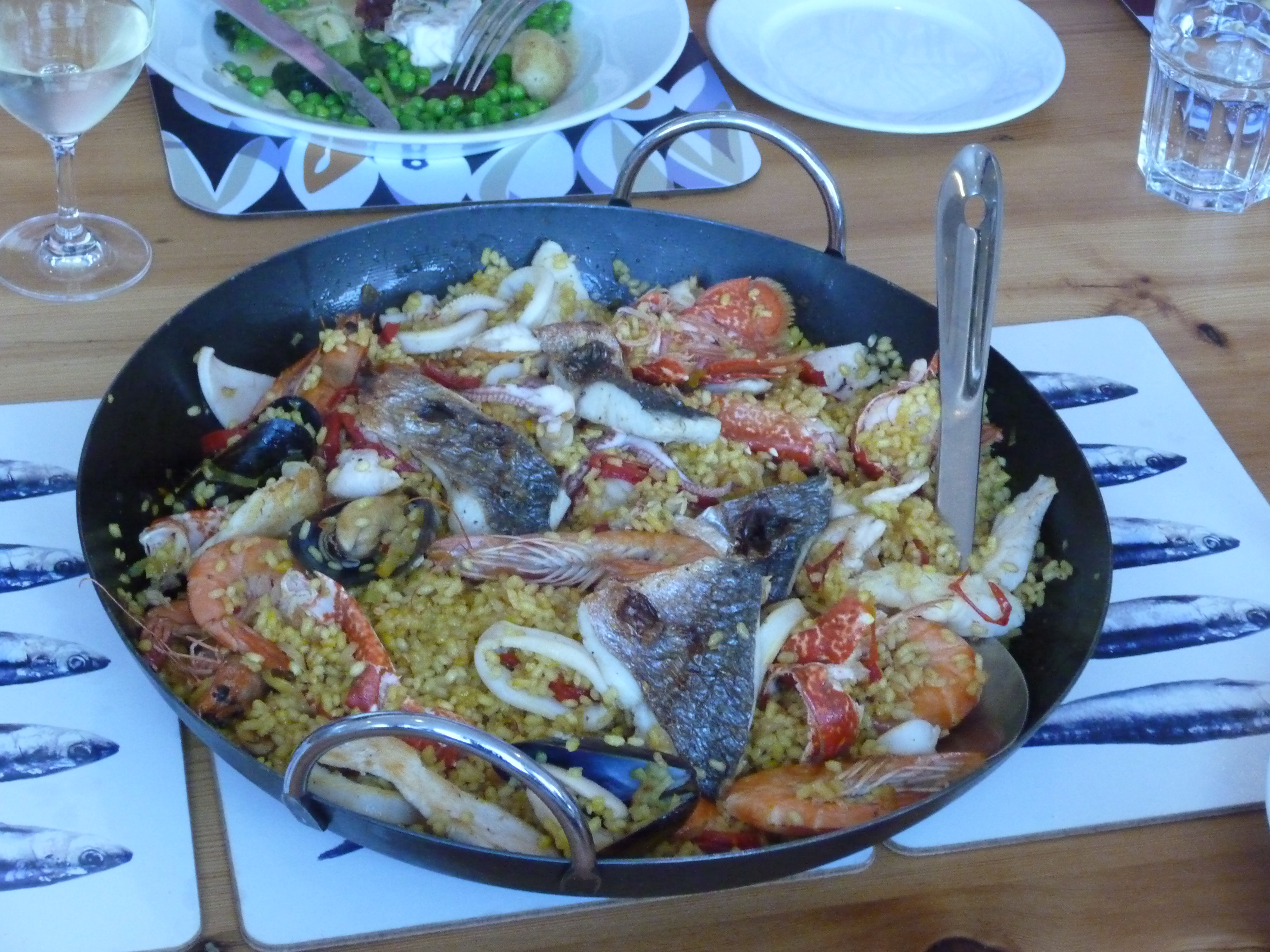 And while we were making this meal (and beforehand), Keith and Andy were making the mother of all seafood paellas, with intimate details of the average squid’s sex life described en passant. Lobster, squid, monkfish, mussels, sea bream. Spanish rice, saffron, which cost a huge amount – if I’d sneezed while smelling the bowl of the stuff that was passed round, £130 would have been on the floor!