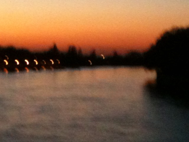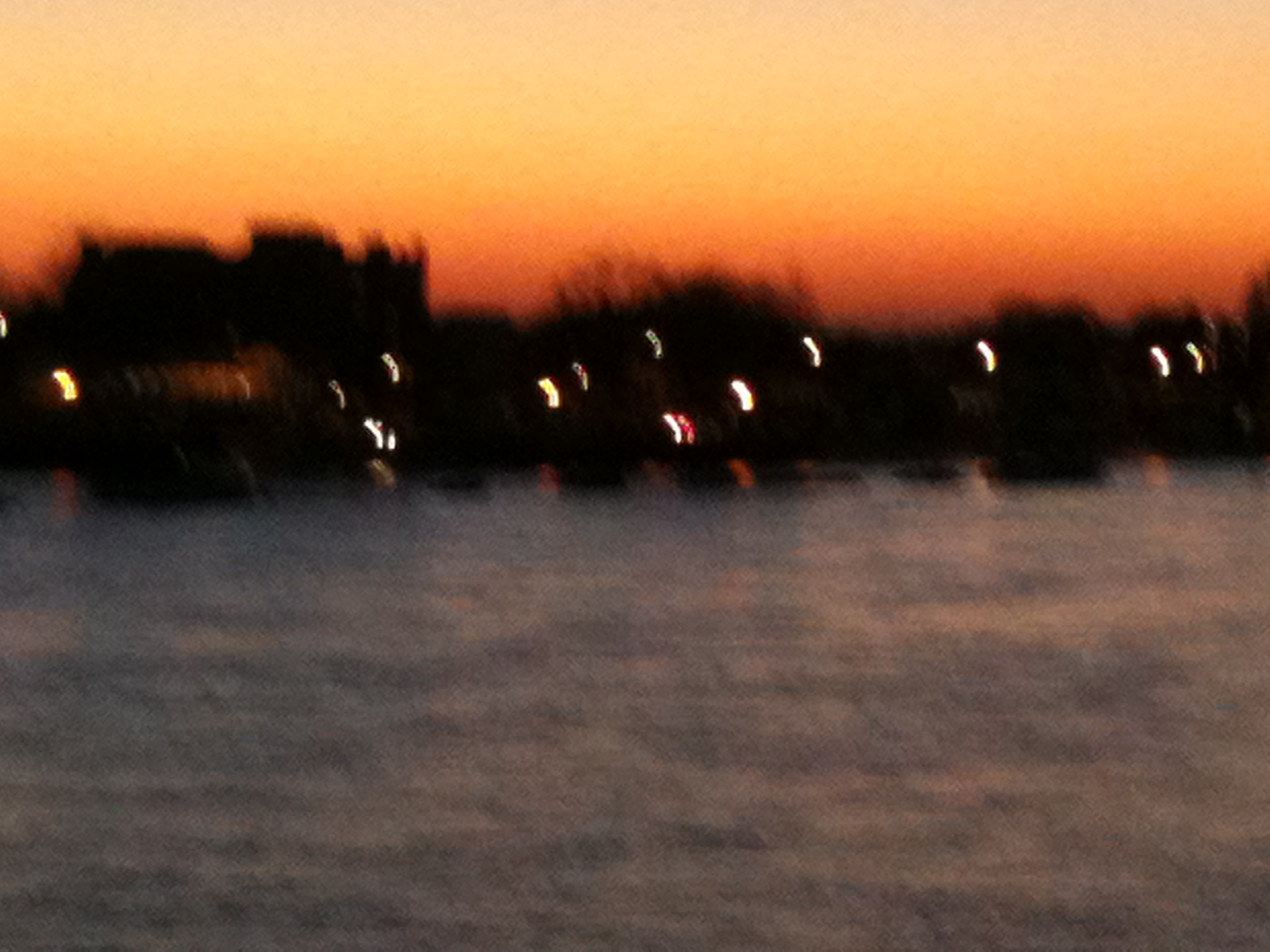 First a few shots out onto the river, the buildings and trees in silhouette, the buildings marked by little dashes of light.