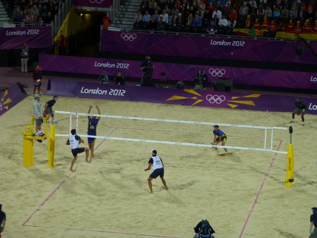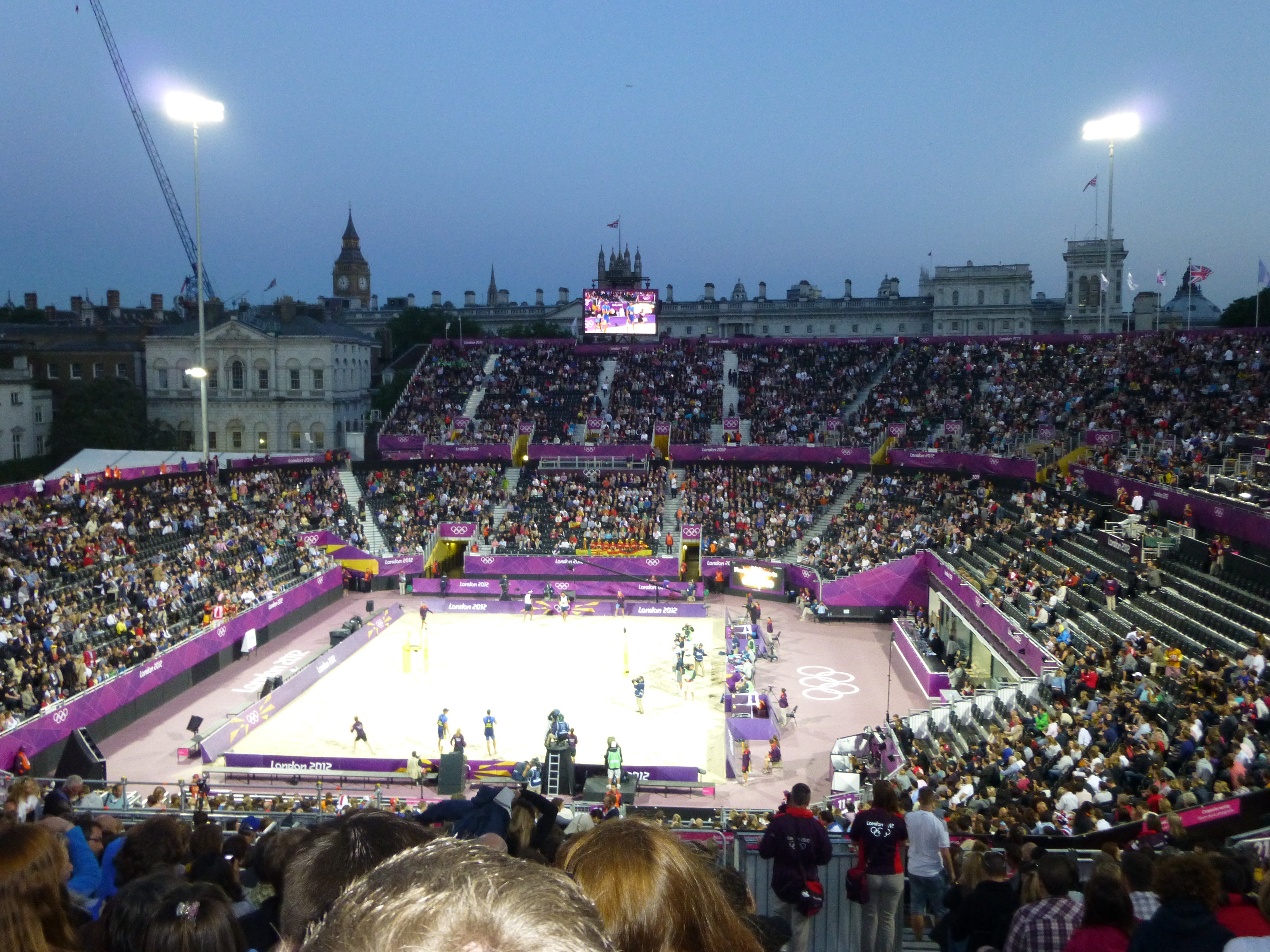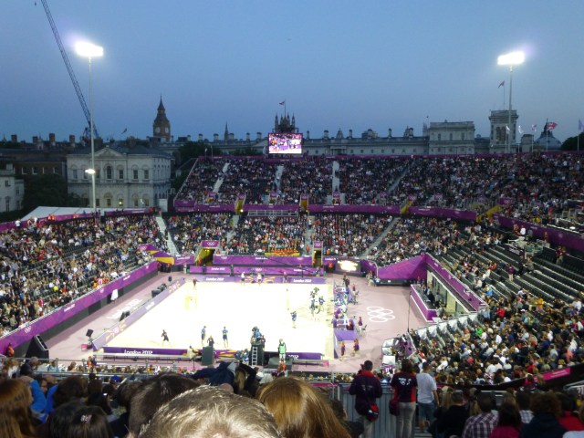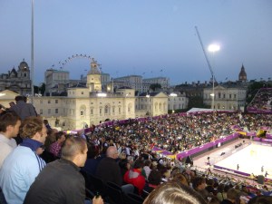 Whoever decided to put the beach in Horse Guards Parade rather than on a beach, say, on the South Coast of England, was a genius. The temporary stadium, holding 15,000, I think, has the most magnificent views and is superb for watching the sport.