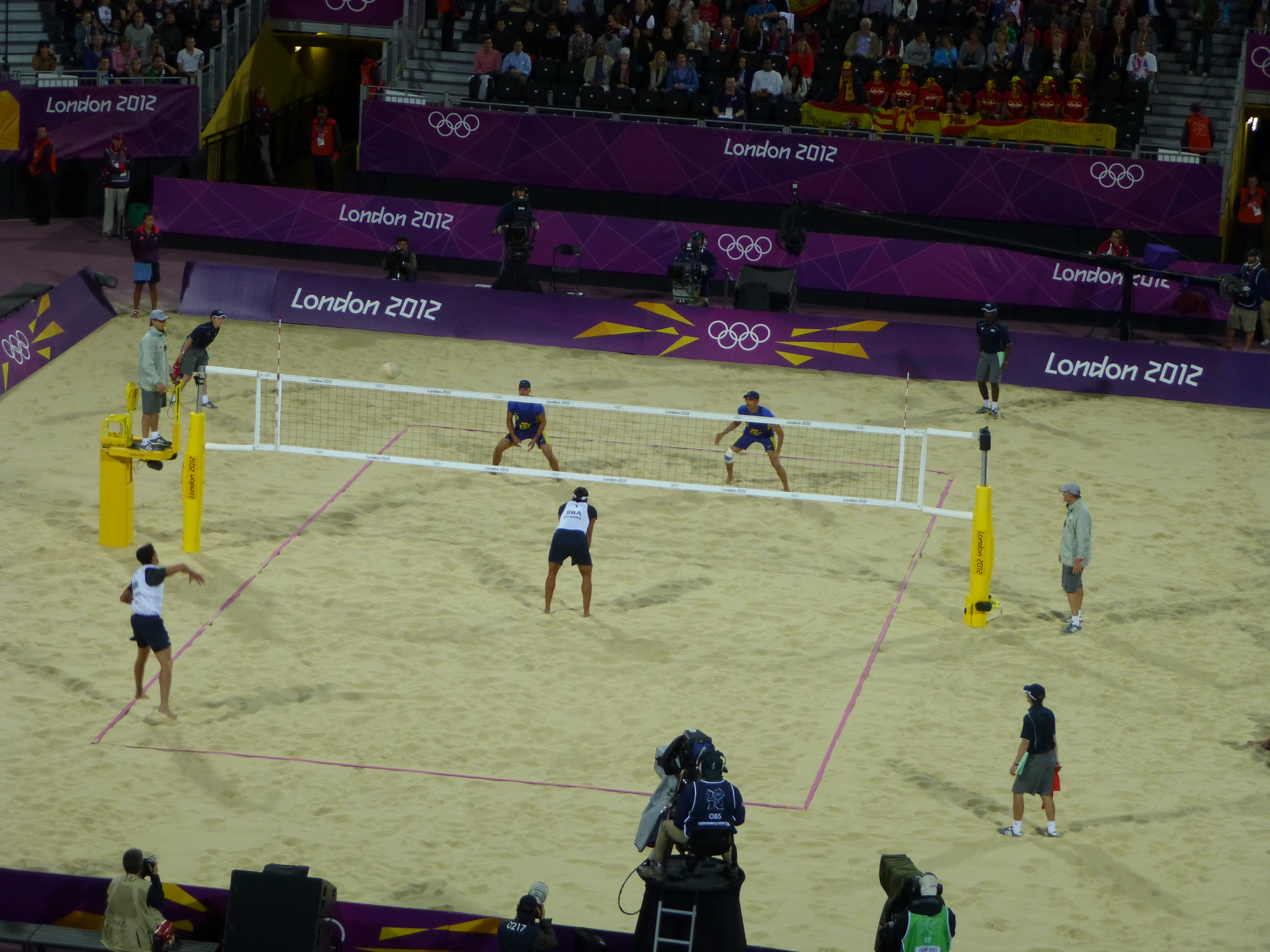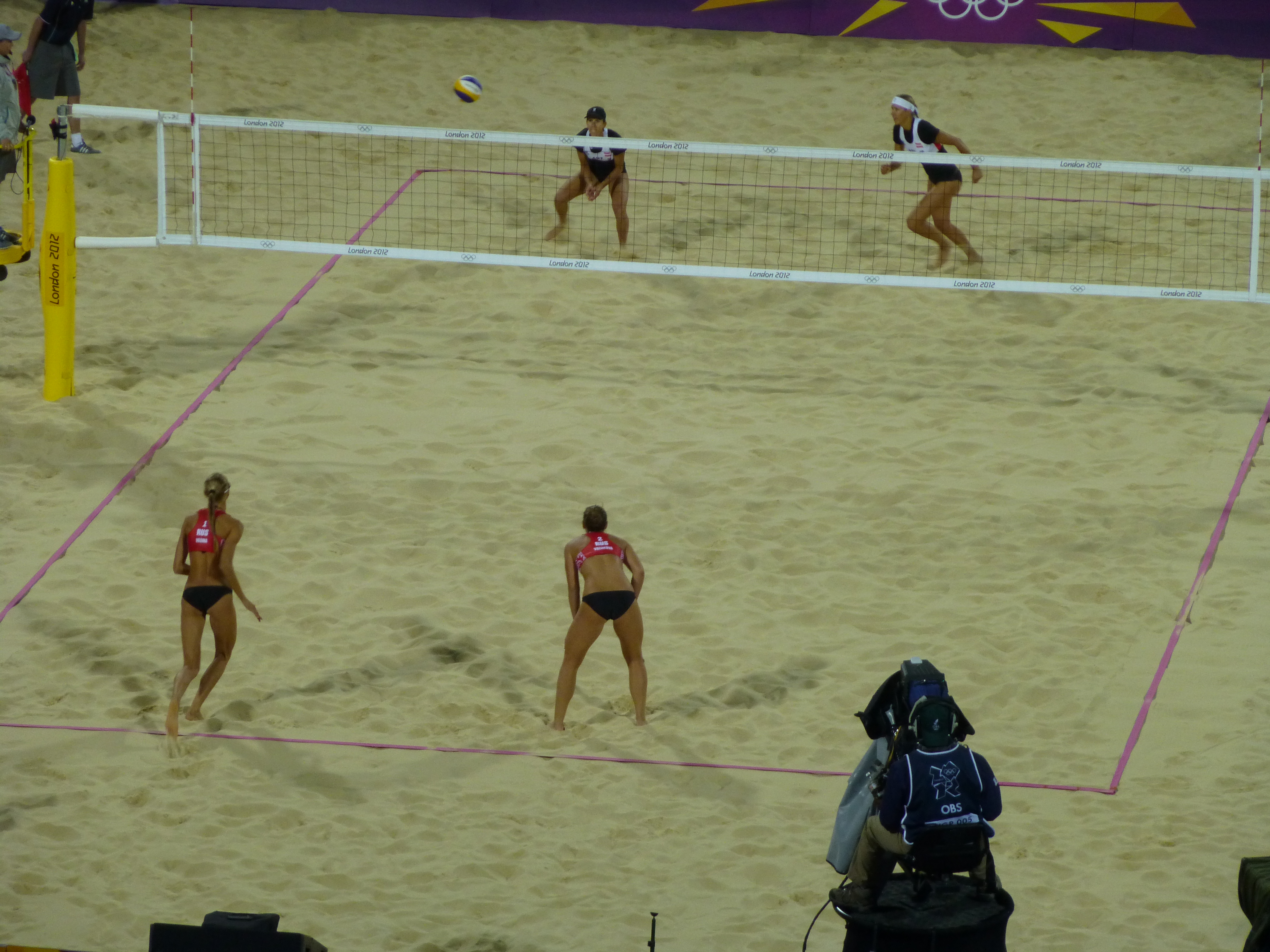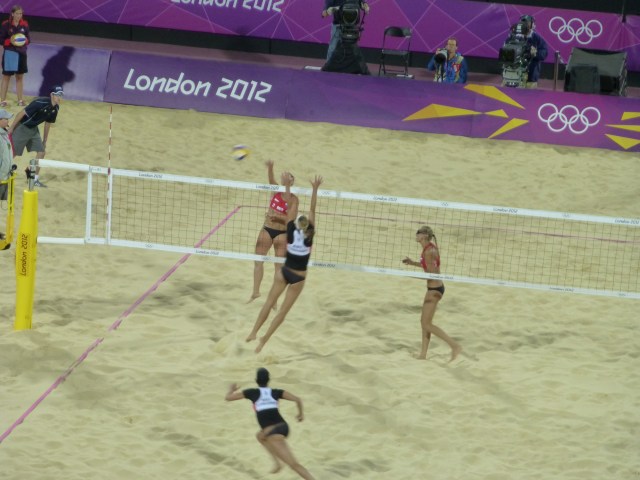 There were two beach volleyball games. Now, I’m sure I had booked women’s quarter finals. But we got a men’s game as well as women’s. Last 16 I think. First up the men, Spain vs Brazil. Brazil won 2-0 in sets. But both sets were really close. Then it was Russia v Austria, women. Same Austrians who beat Australia. And they won again last night (as it now is as I write). 2-1. The crowd seemed behind Russia. Whether it was in any way about their looks and the fact that even in the chill of evening they stuck to bikinis, I wouldn’t like to say…