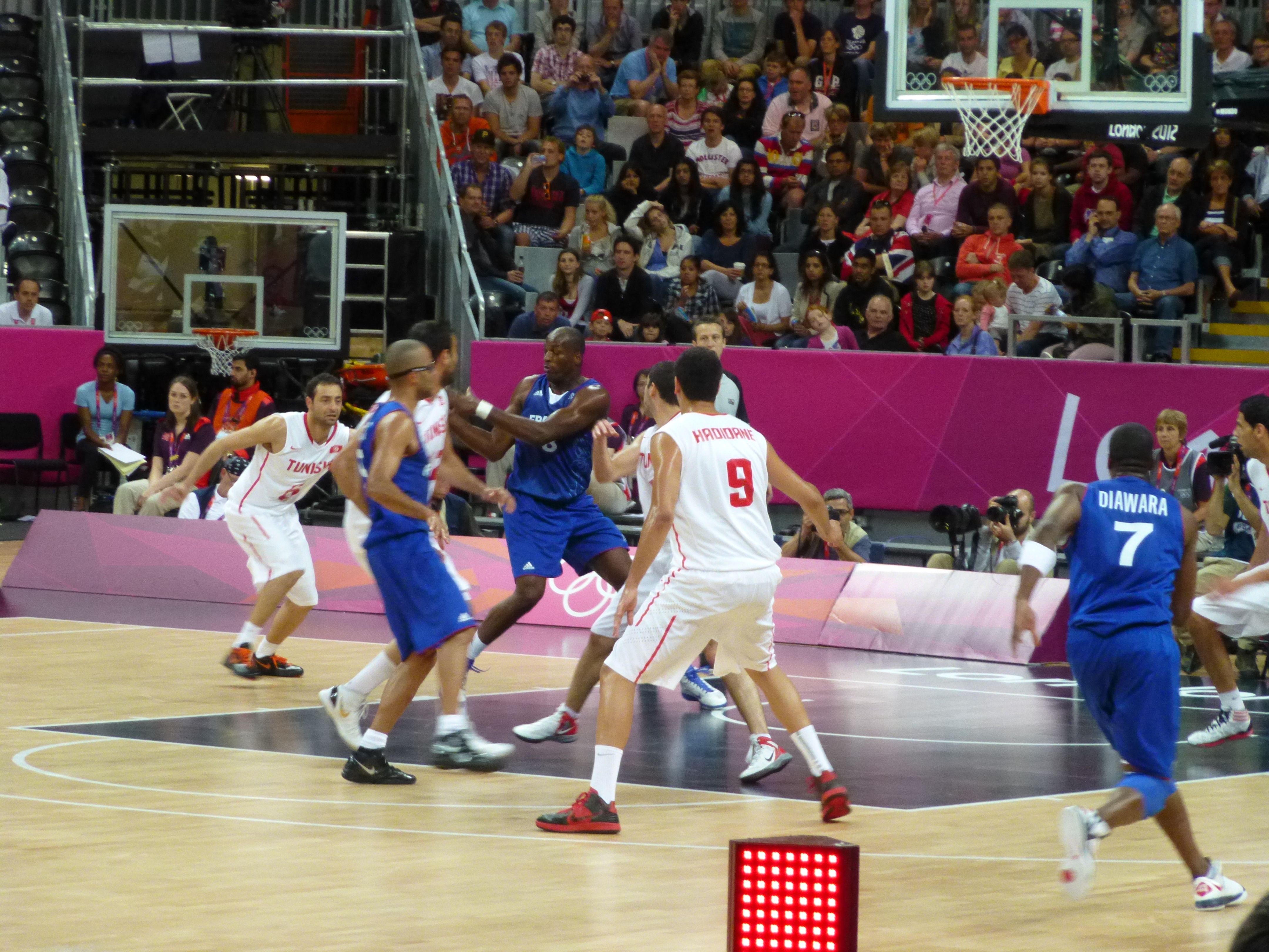 At the basketball, we had excellent seats, very near the front. You could hear the boots squeaking as the players twisted and turned. First up was France v Tunisia.