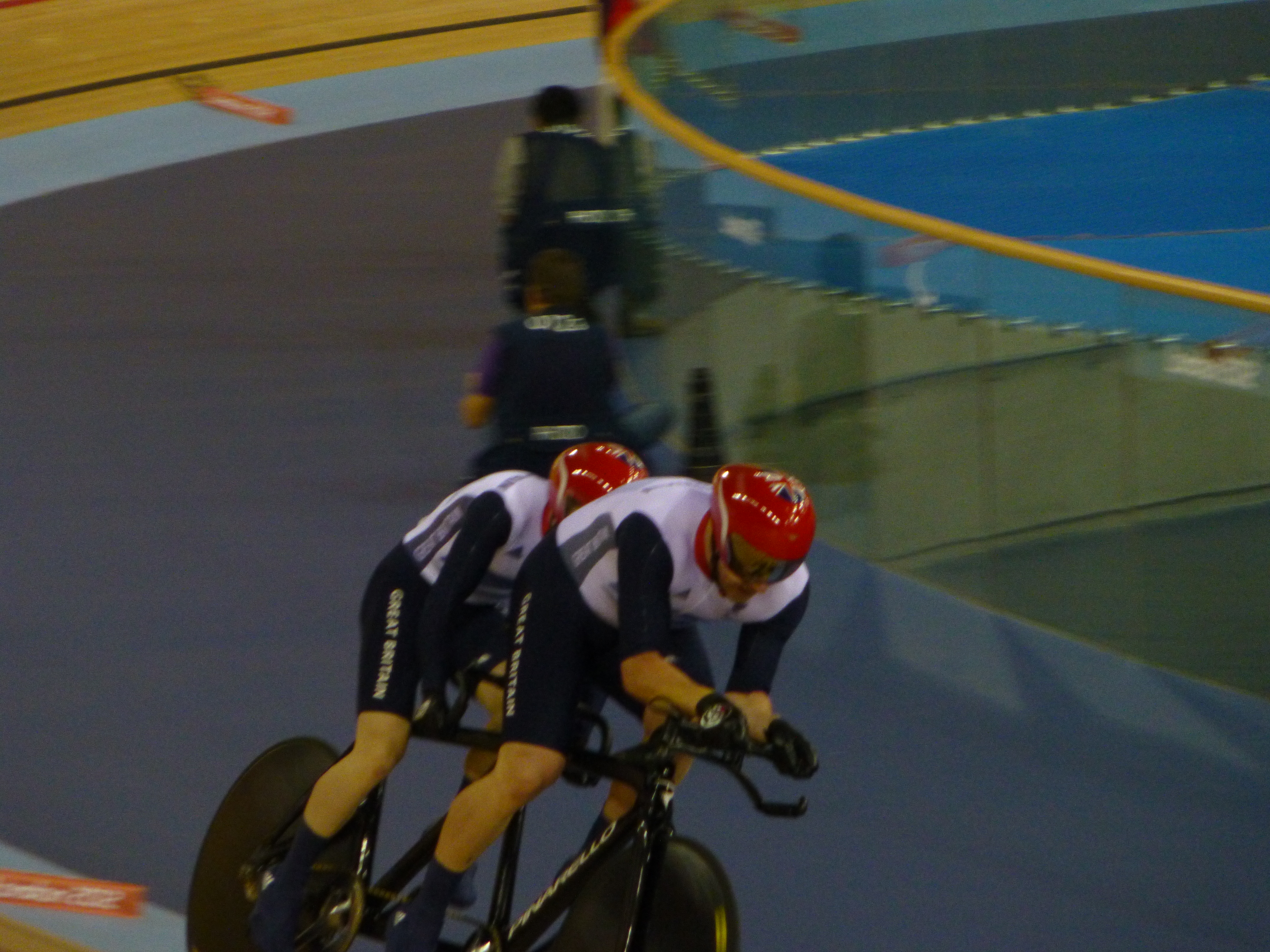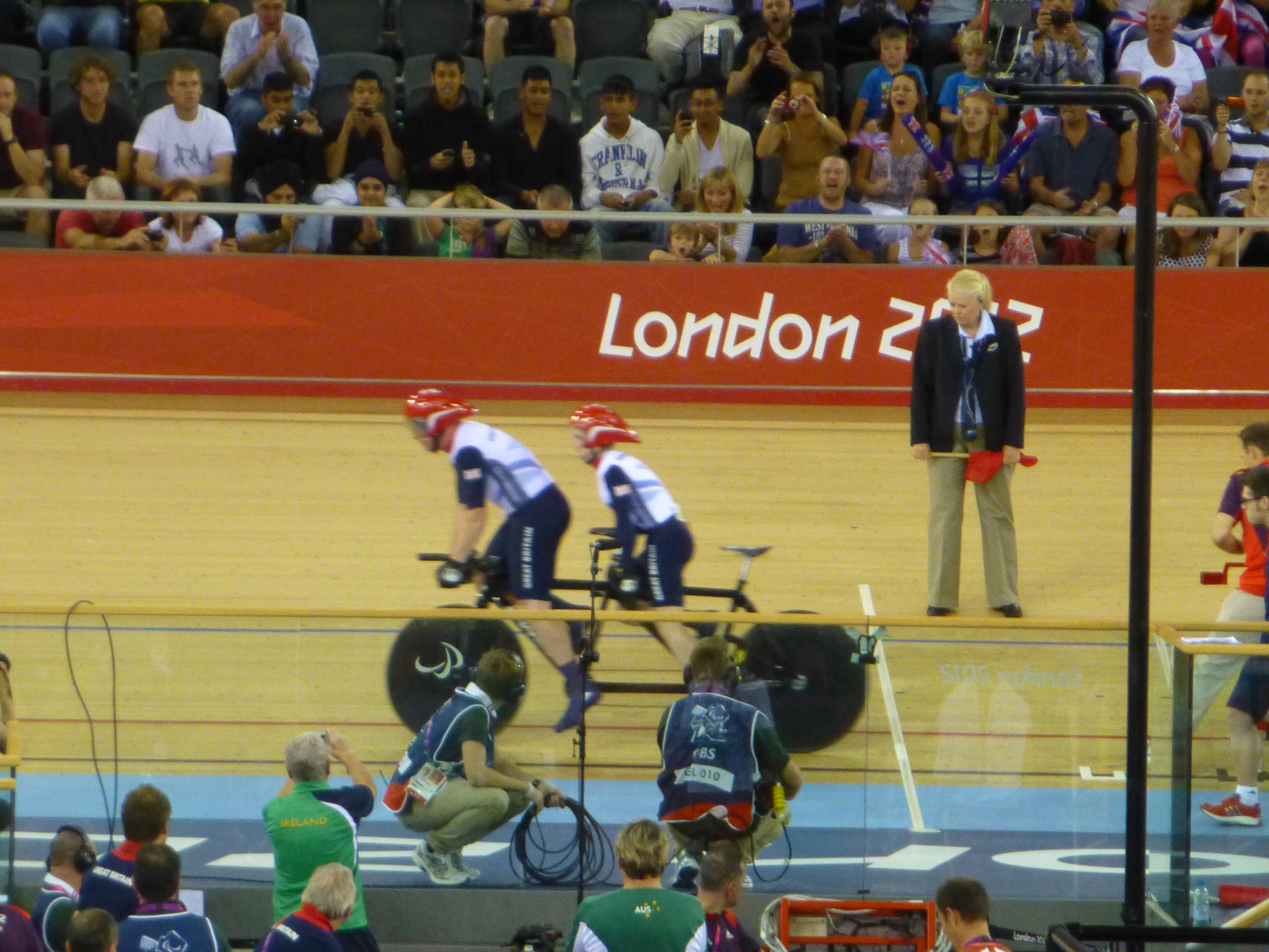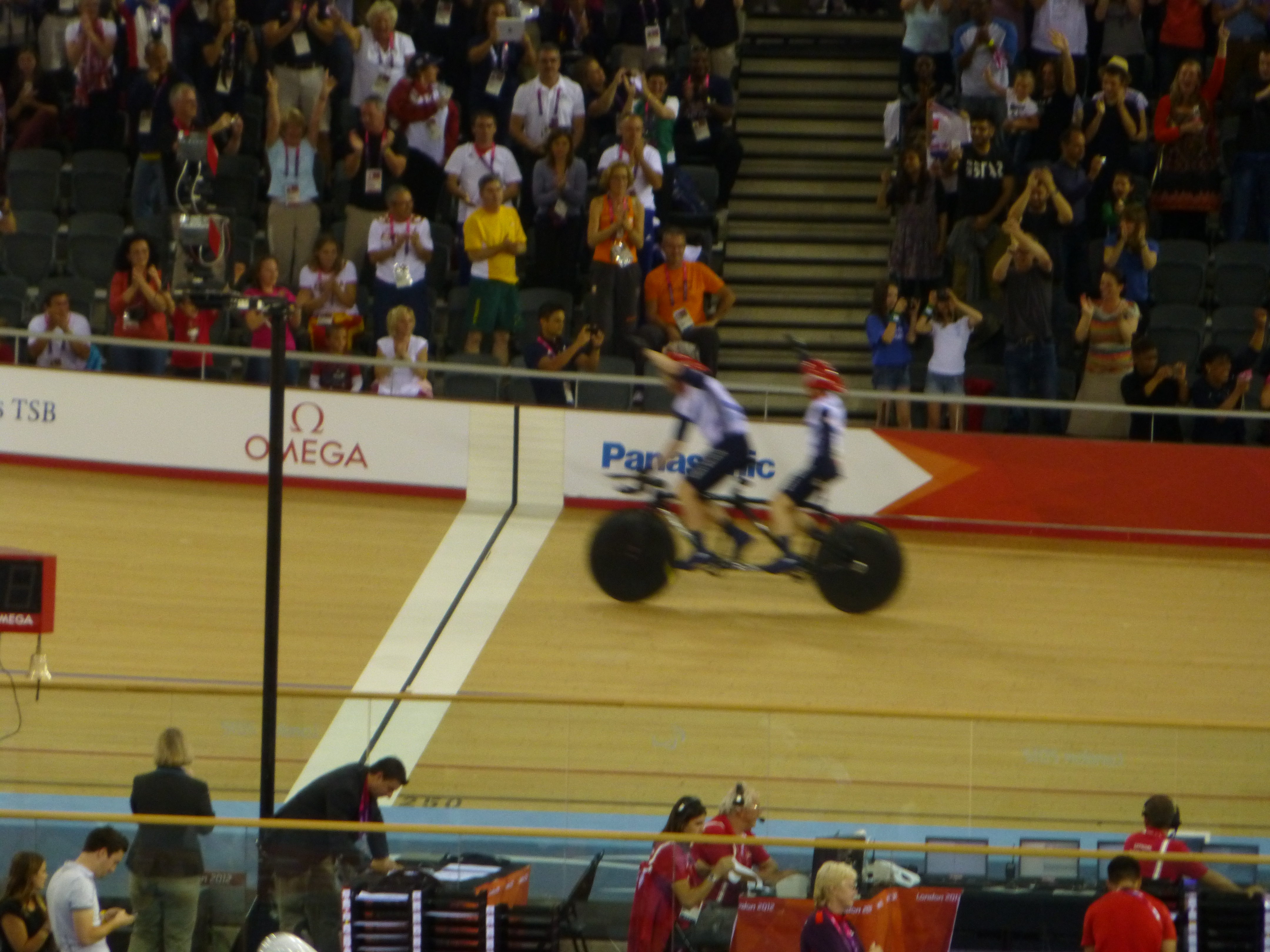 The first race was the men’s 1km time trial tandem race for visually impaired riders. It’s a two man race (obviously, being a tandem!) with a guide at the front and the main cyclist at the back. Quite how it’s designed so that the rider at the back determines the speed, I’m not sure, except that the cogs at the back wheel are much bigger than those that the front rider are pedalling through. There were two British partnerships in the race: Neil Fachie and Barney Storey and Anthony Kappes and Craig Maclean. They were the last two pairs to race, so were favourites. Faschie and Storey were amazing and the roar that drove them on was immense. You get this wave of sound as each part of the crowd urges them on as they pass that section by. So in the crowd it’s like a sonic Mexican wave. But for the riders it will be constant as they move around the track. It has to be inspirational.