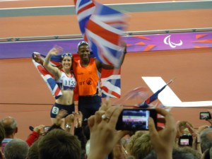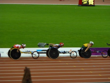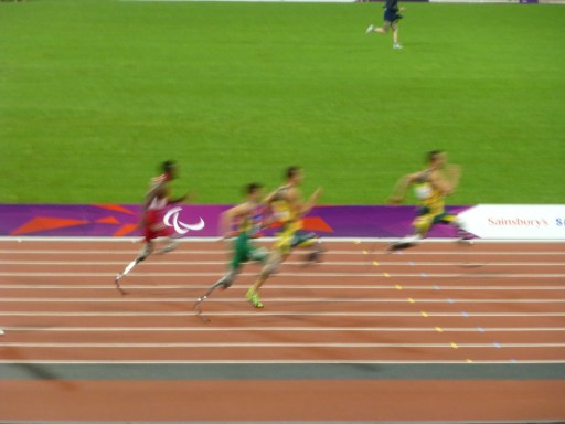 But shock. After leading so clearly, Pistorius was overtaken on the line by Alan Fouteles Cardoso Oliveira of Brazil (the guy in green, lying third in this shot). In the stadium we applauded the winner, and remained unaware that soon after Pistorius cast doubt on Oliveira’s blades. Great story for the media. Overshadowed everything else. On the one hand a shame. On the other, the controversy normalises the Paralympics. Gives it greater prominence in the headlines. Pity, but that is how the media operates. Jody Cundy’s outburst and Pistorius’ allegations were the headline moments. The Paralympics go mainstream.
