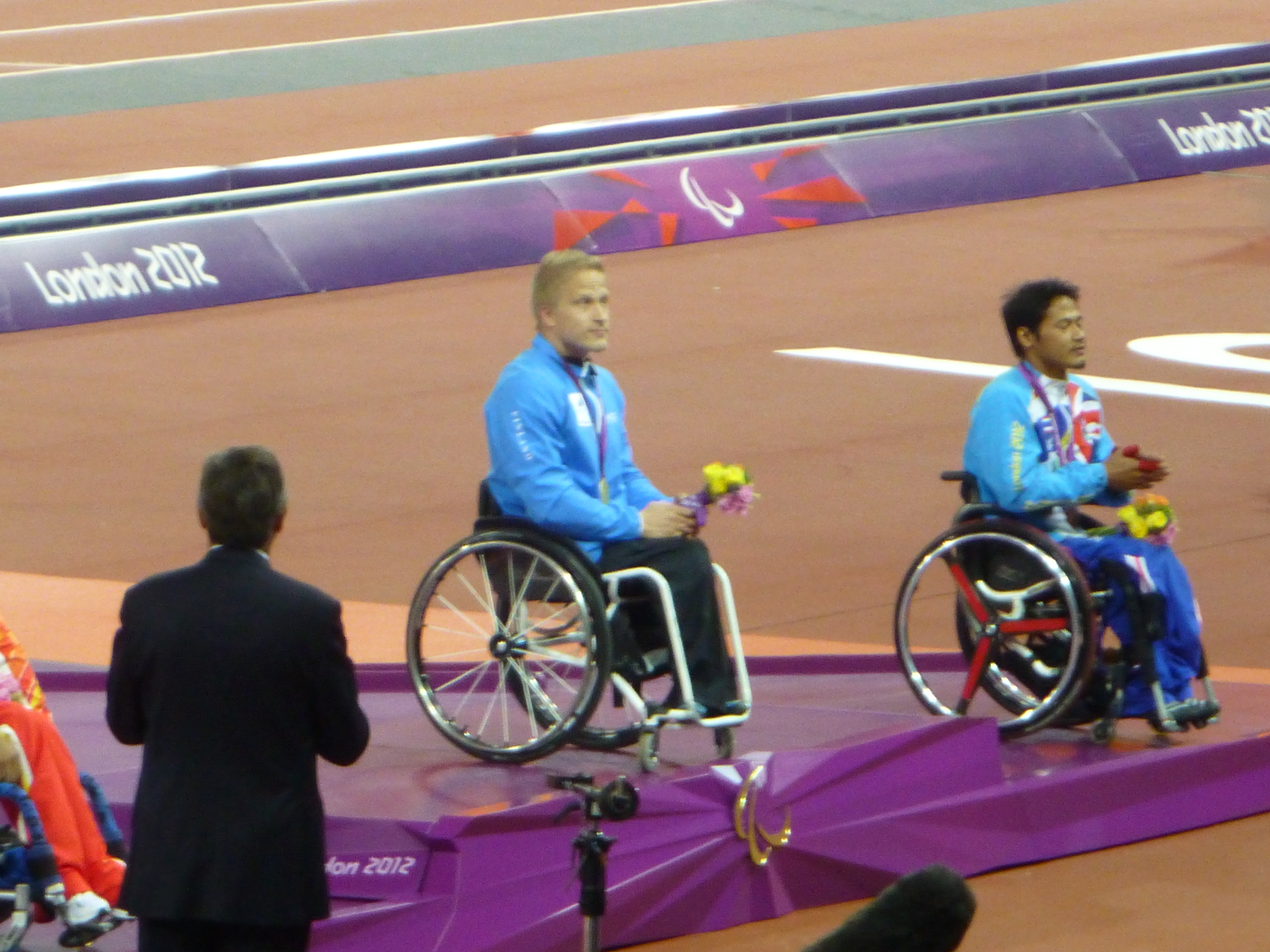 In the men’s T64 100m, which was a wheelchair race, the Finn Leo Pekka Tahti won, I think, for the fourth Paralympics in a row. Respect.