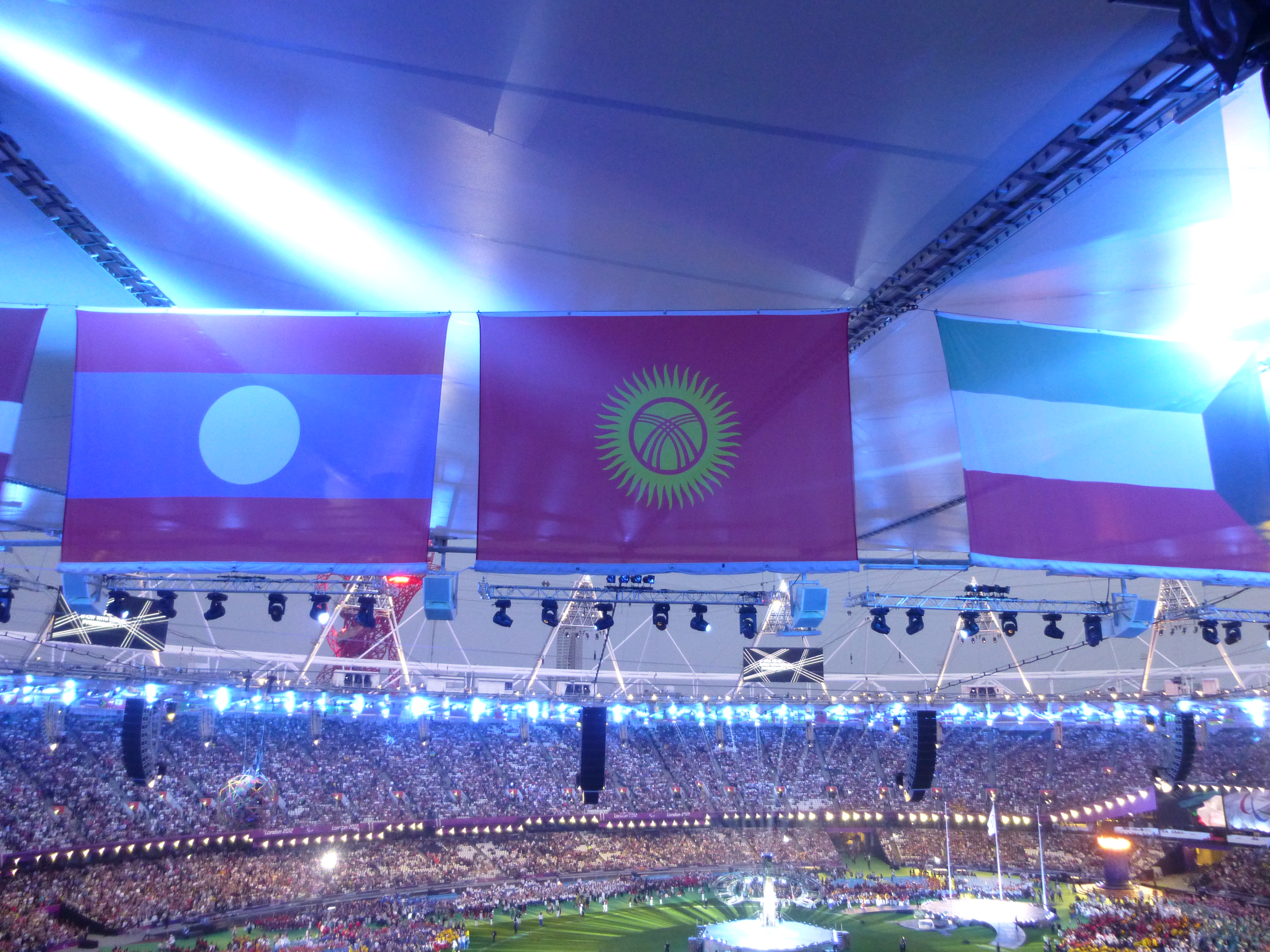 We had these flags in front of us. No-one knew which countries they were Checking since, I think it was Kyrgistan, with Kuwait and the Lao People’s Democratic Republic (ie, Laos) either side.