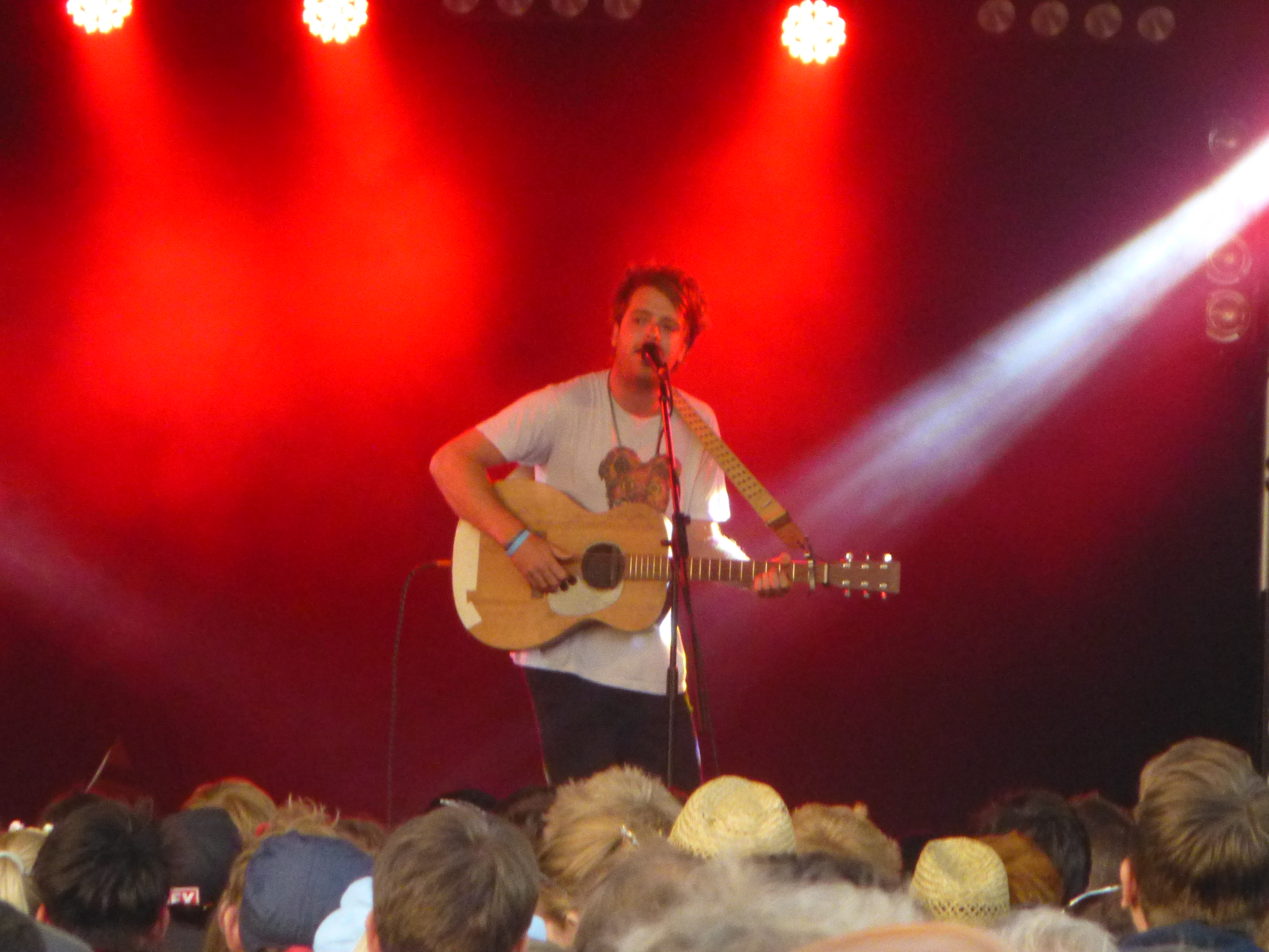 Chvrches (not a typo) were next, at the iArena. Packed it out for their indie 80s style synth beats. An up and coming band. Reminded me of Human League and Erasure, but I’m an old geezer and I can’t help it. Good stuff. A8/B7. I listened a bit to MO (need that Norwegian line across the O) on the Lake Stage (which faces the central area of the grounds) while I ate a luxury meat tapas platter – which was OK. Floaty Scandinavian rock/pop. A5/B5. Then stuck around the Lake Stage for York singer/songwriter, Benjamin Francis Leftwick. He had a big and young following. Easy option would be to compare him with Ben Howard. Less intricate guitar; deeper, resonant voice. Very good. A8/B7.