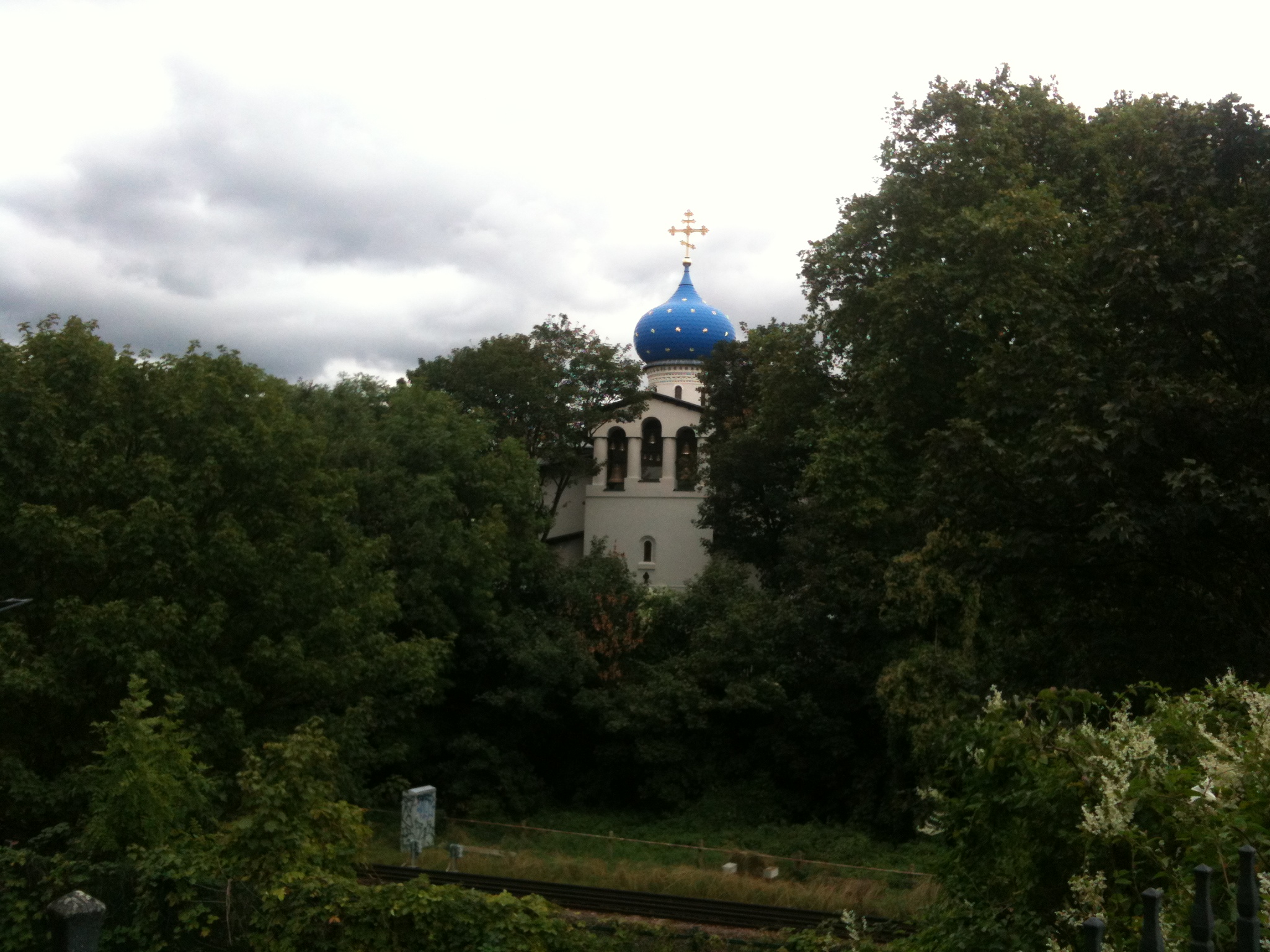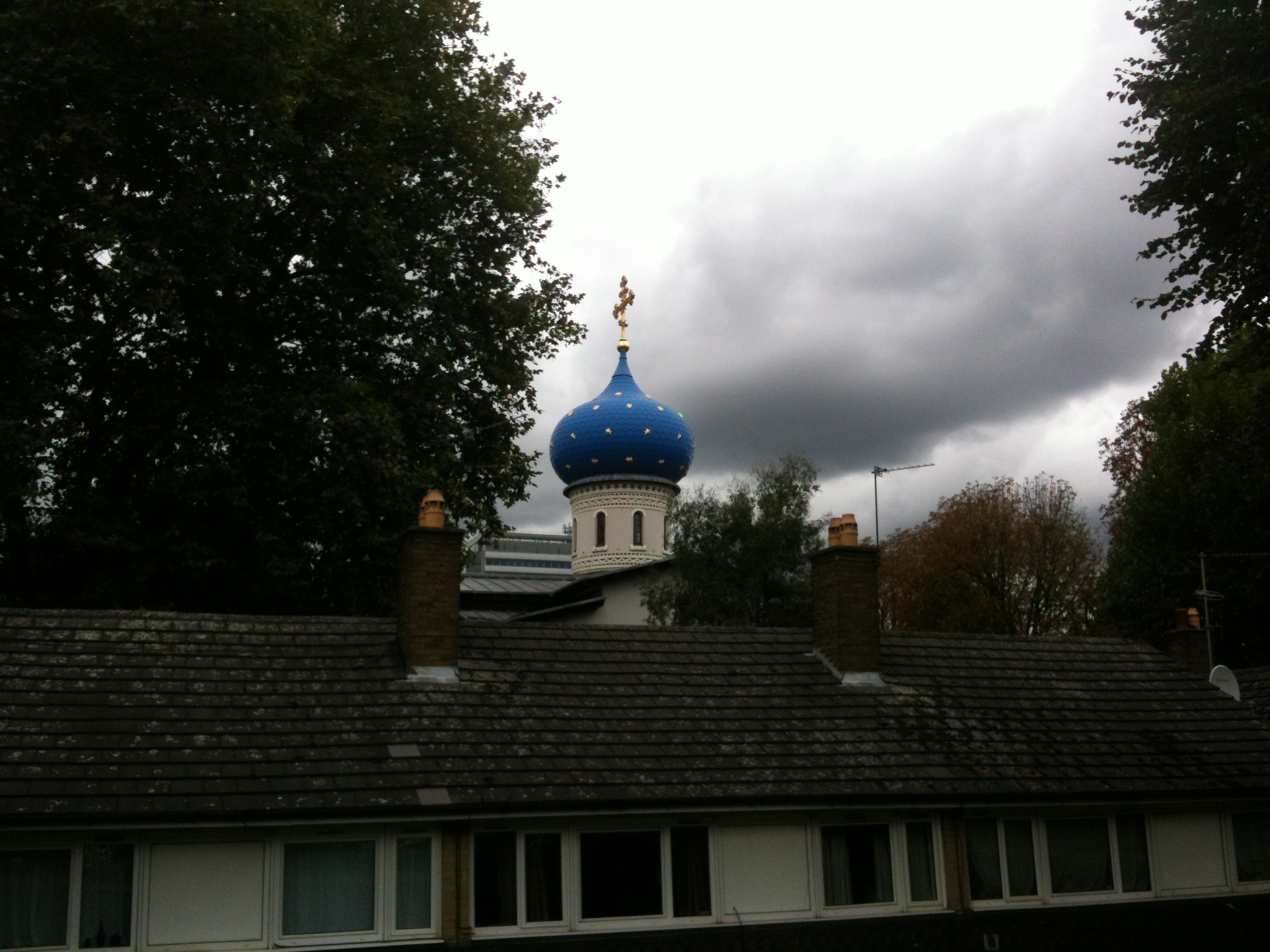 This is the Russian Orthodox Church Abroad’s Cathedral of the Dormition of the Mother of God and the Royal Martyrs. Catchy name! It’s in Gunnersbury, just by the A4, where it joins the M4. Hemmed in by a railway, a dual carriageway and some distinctly downbeat housing. But I love the way that blue dome sticks out defiantly, rising above its humdrum surroundings. I cycle past it frequently, as I’m coming back from my cycle to Putney Bridge along the Thames, and always wonder how it got there…