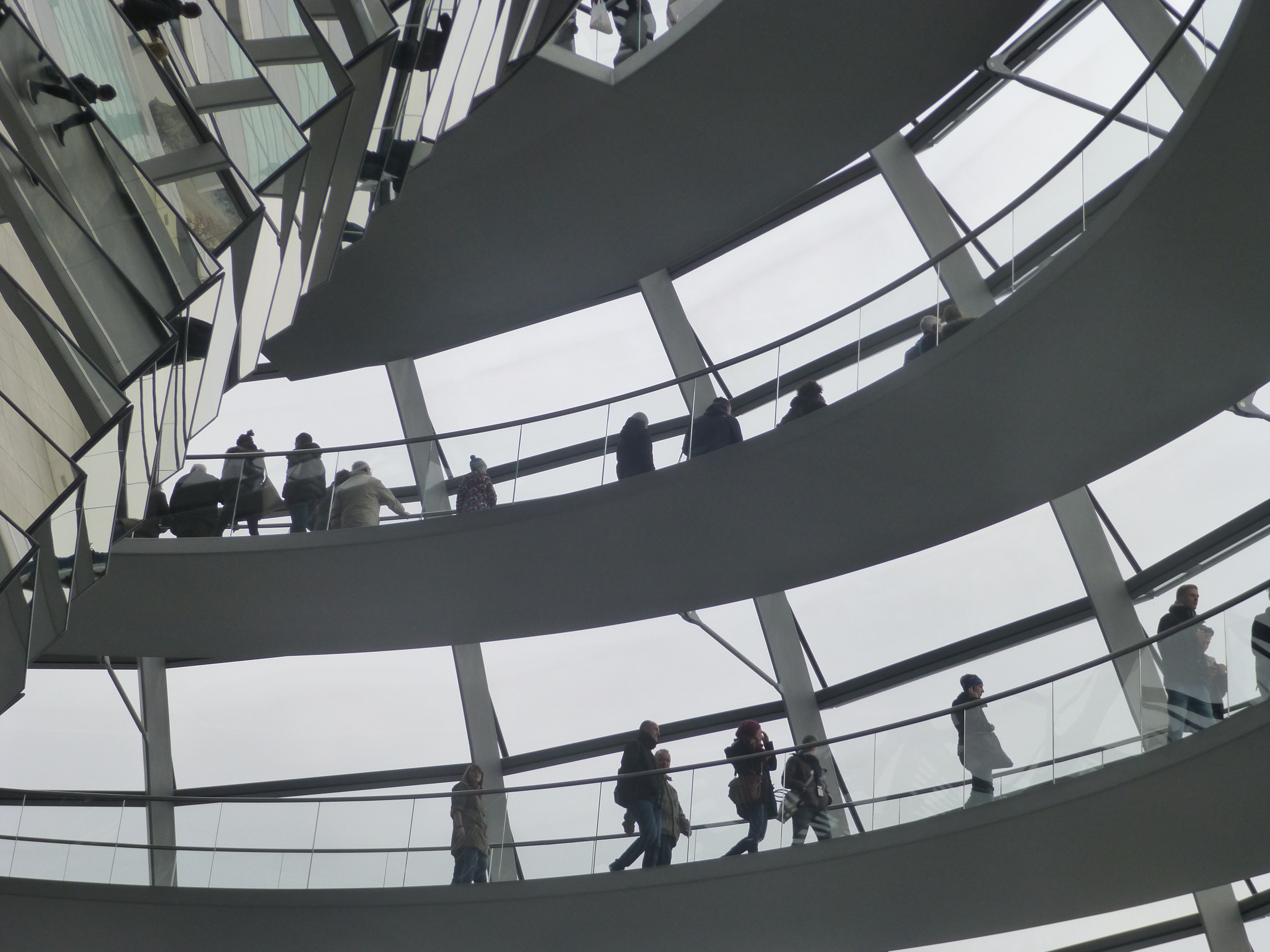 In 1991, the Bundestag in Bonn voted – only by 338 to 320 votes – to return to the Reichstag in Berlin. Sir Norman Foster was commissioned to reconstruct the building and the Bundestag moved back there in 1999. The most exciting new feature of the building is the Dome. It is truly a marvel. If you are in Berlin, you must visit it, but be aware that you have to book a couple of days in advance and supply details of everyone who is visiting. Here are a few photos. It is endlessly fascinating.