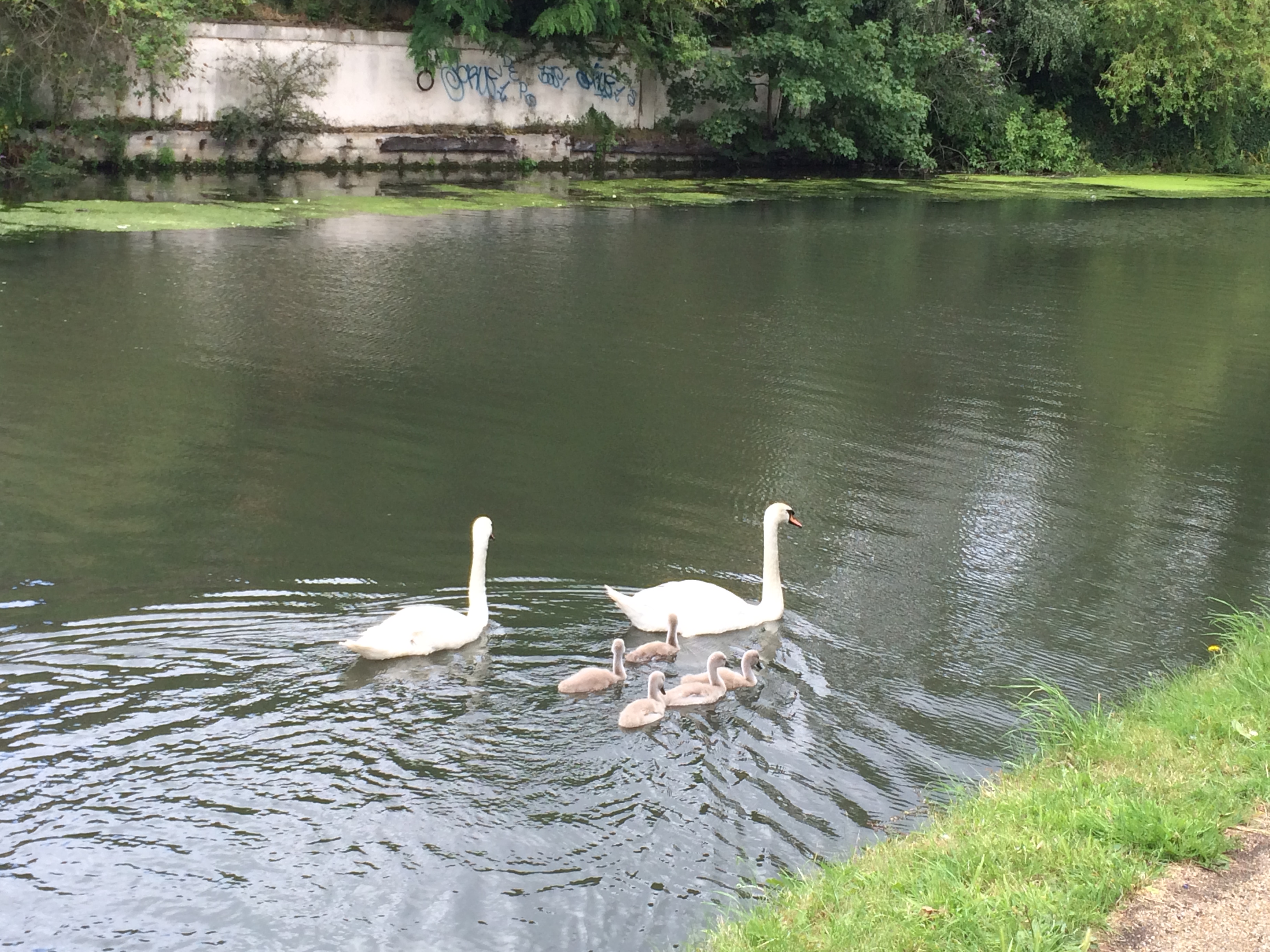 I missed the perfect shot, when the family were gliding along in single file, adults at front and back. But as soon as I stopped and fumbled for the iPhone, they naturally came over to check whether I was offering food.