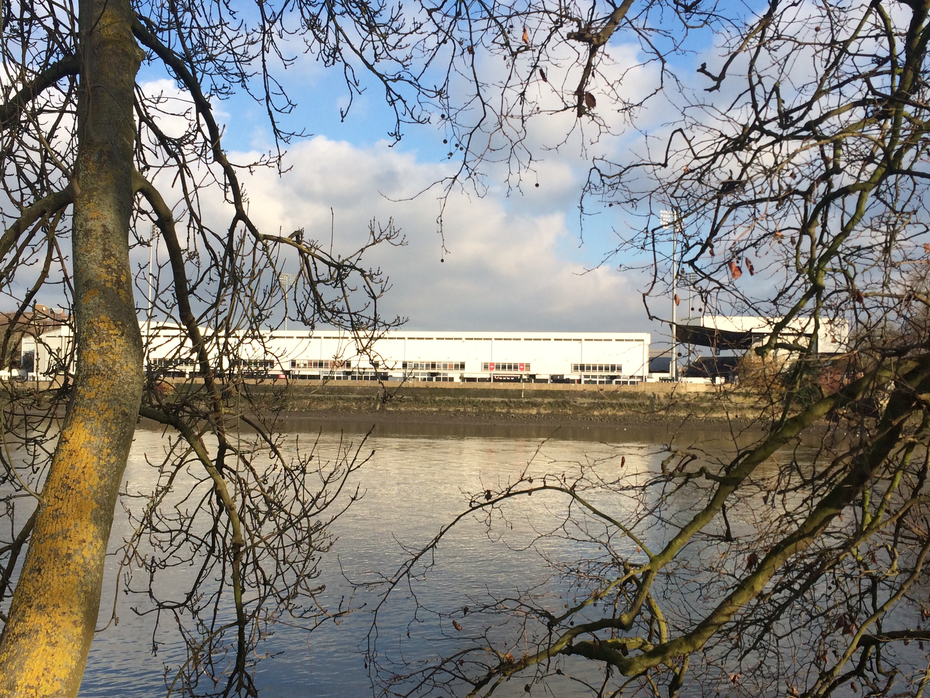 Fulham football club’s ground, Craven Cottage, from the other side of the Thames, today. Just as I went to take a photo, a flock of Canada geese took off. I just about captured them.