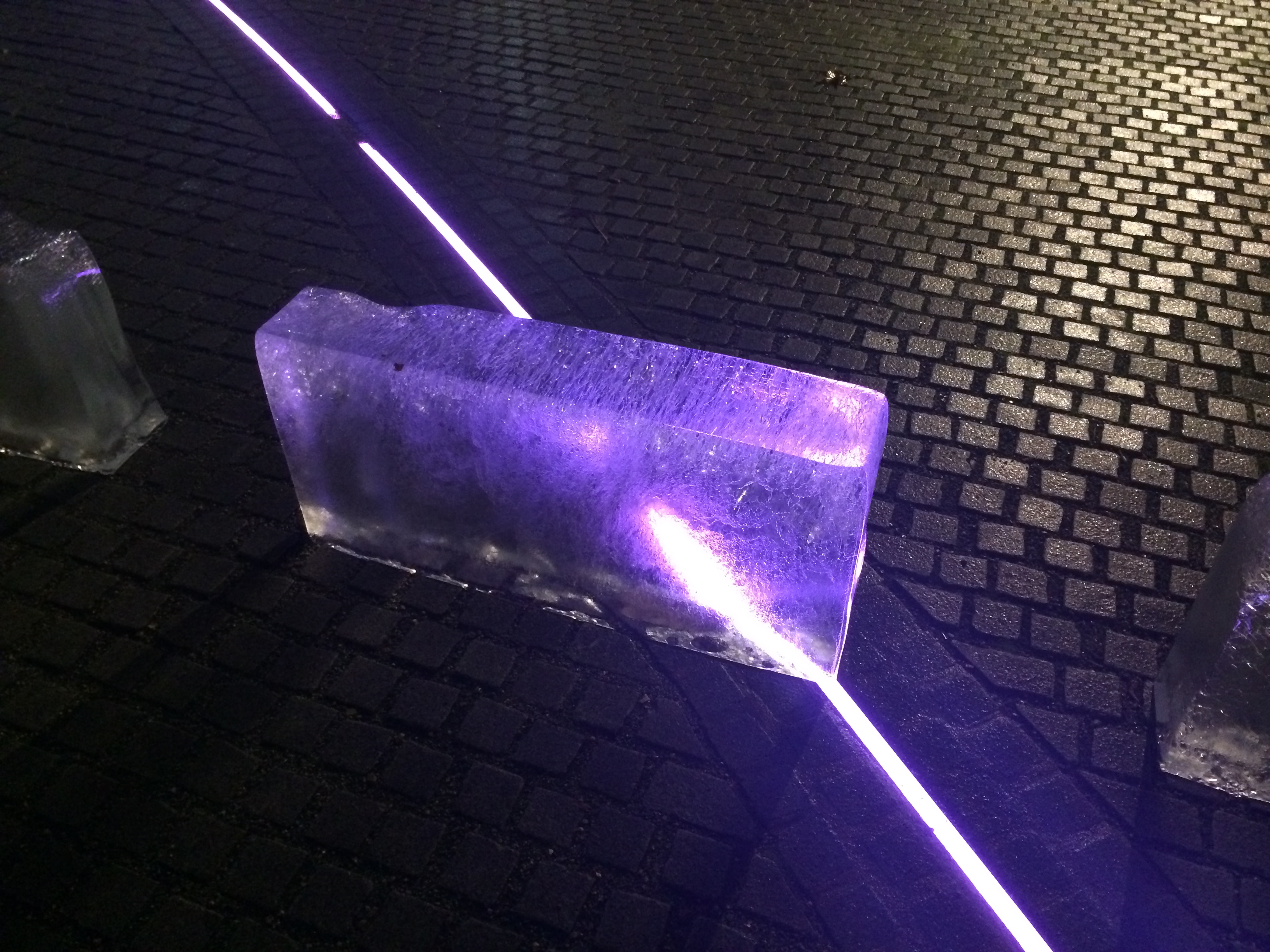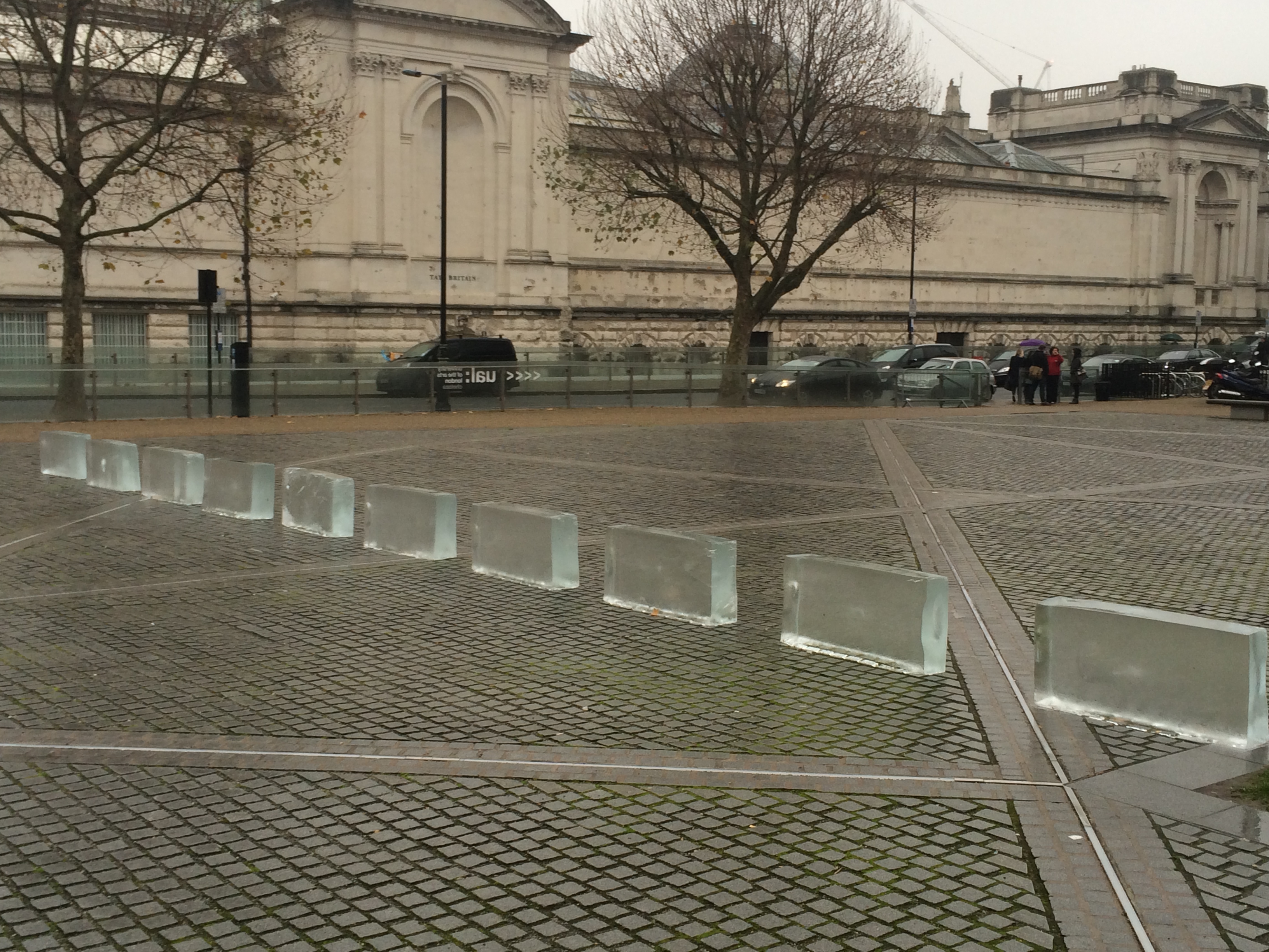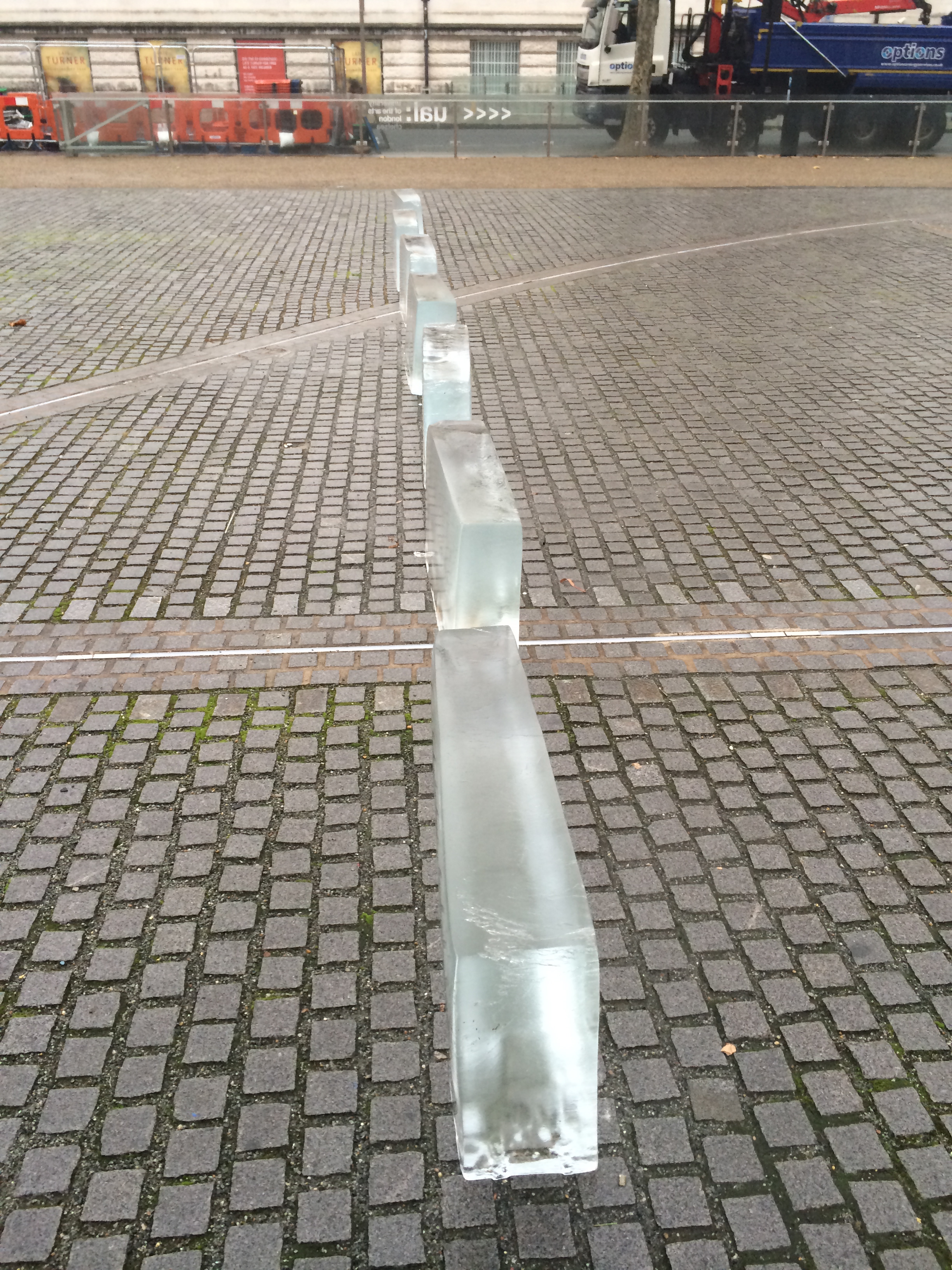 The latest sculpture in the courtyard of Chelsea College of Art. Yes, they are blocks of ice. On Wednesday, as I walked into work, I saw a woman taking them out of cardboard wrapping and placing them on the cobbles. They survived the day – no melting – and were there this morning when I took these daylight photos. Who is responsible, what do they mean? What have they got in them to stop melting? No idea!