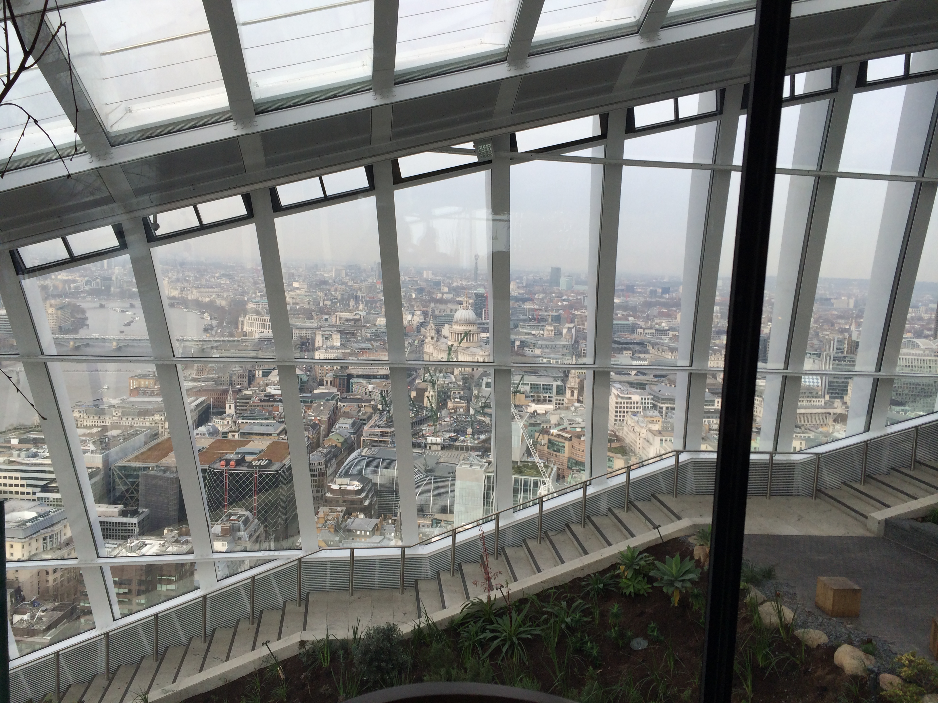 The lift takes you to level 35, and from there you walk up to 36. I stopped on the way to view three examples of the monumental. The Nat West Tower, once the tallest, the Cheese Grater and the Gherkin. The Nat West never got a nickname; then again, what could it be?
