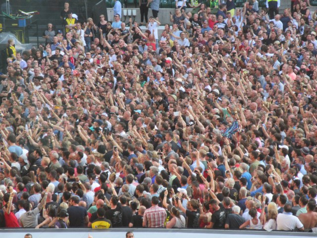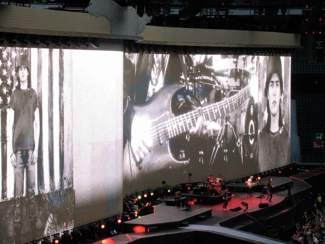 The band went off briefly, and returned for an anthem and then a bit of rock’n’roll, U2 style. To my great delight we started with “Miss Sarajevo”, a wonderful song off the “Passengers” collaboration with Eno. A tribute to how people keep things normal in times of war. Transposed to the plight of Syrian refugees in Jordan. A big flag passed around the lower tier of the stadium to that effect. Then that rock’n’roll. Three songs with big riffs and kaleidoscopic backdrops: “Beautiful Day”, “Elevation” and “Vertigo”. It was noticeable around where we were sitting, which was quite expensive, as I’d pressed “best price” on Ticketmaster while loads of tickets were left, that these songs got the best reaction of the night. That tells me I was ten years older than a lot of the crowd in my area, and a bit less inclined to to the obvious favourites. And when people pushed by, going for beers during “Bullet the Blue Sky”, I did wonder why they’d come to the concert. But y’know, we all have our different U2s, just like we do our Bruces and Radioheads.