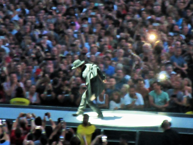 Then, finally, three from “Achtung Baby”, the album which, for me, rivals “Joshua Tree” as U2’s best. “Mysterious Ways” with its electro-funk beat, Bono’s vehicle for getting a woman out of the crowd to dance with him. And have her five minutes of fame, as the screen captured her image in multi-colours. Whatever you think of Bono choosing someone 30 years younger and getting out the video camera, it was a spectacle, and the fan had a night to remember, hugging the band members and being on that screen. Unreal.