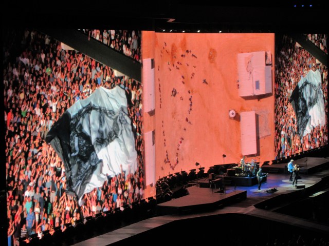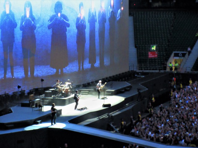 Now, I’m well aware that U2 divide opinion. They’ve been doing so ever since Bono strode out with a white flag in the early 80s to the strains of “Sunday Bloody Sunday”. And especially since Bono took on his role as a spokesman on the big issues the world faces: poverty, war, debt, exploitation, imperialism, hate. And some people just don’t like the music, which has always erred towards the grandiose. But I love the music, especially from the period that spanned “The Unforgettable Fire, “The Joshua Tree”, “Achtung Baby” and “Zooropa”. (I can live without the live album “Rattle and Hum”, though it had its moments.) For me they combined some of the great riffs and anthems with that thing I called celtic soul. Bono called U2, last night, “the loudest folk band in the world”. I get that.