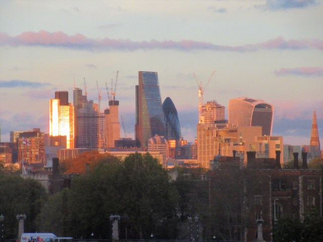 From our office on Millbank we have a great view of the river at Lambeth Bridge and the City beyond. As the sun goes down at the moment, it reflects in the glass of a couple of the buildings and imparts a glow over the whole cityscape. It’s quite stunning when the skies are clear. The shots here are taken through a window which is (a) a bit mucky and (b) was just beginning to reflect back the pattern of the room. So they are not crystal clear, but are OK, I think. Hope you like them.