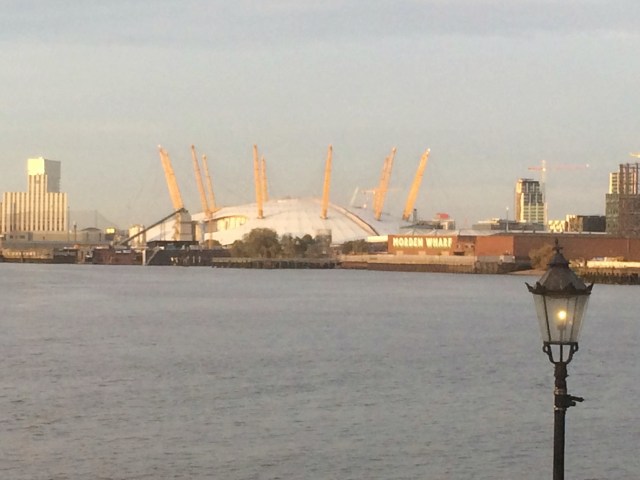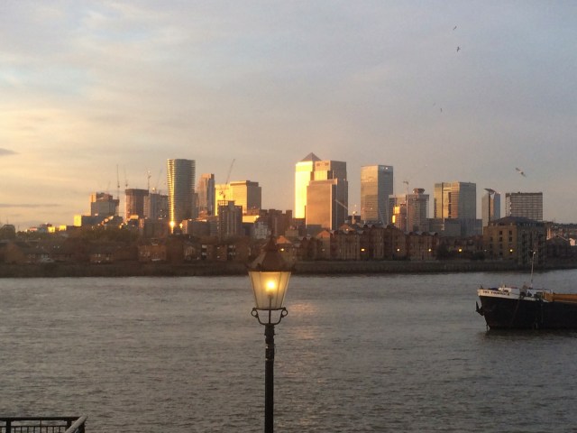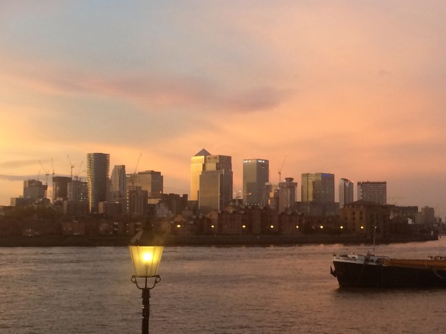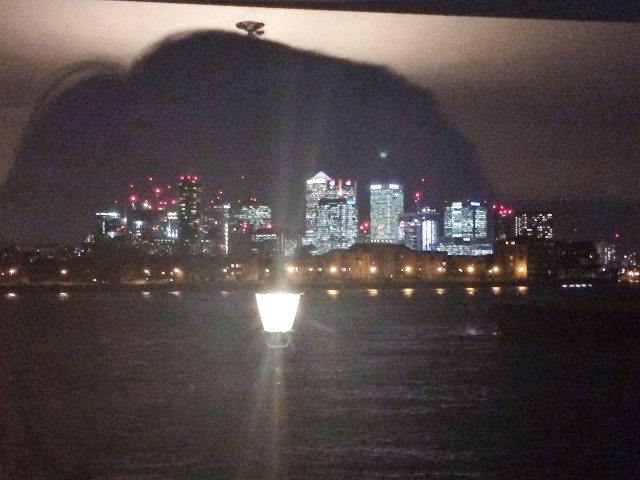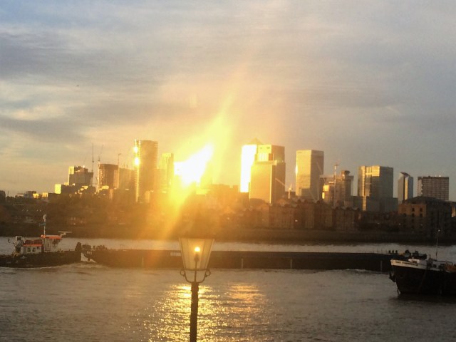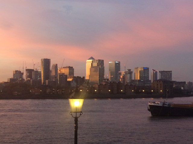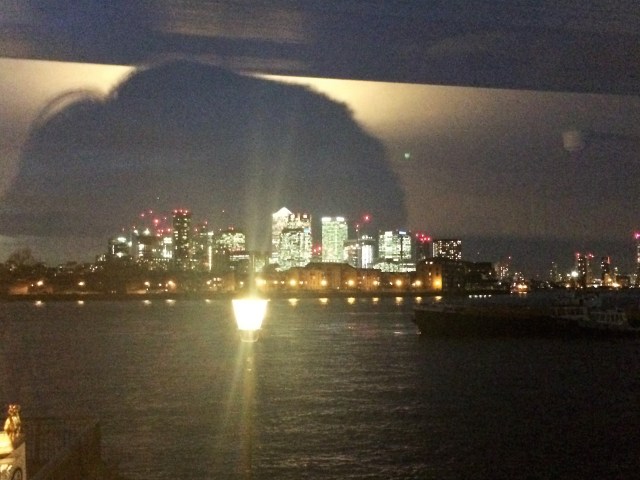 This is a bit of a companion piece to my last blog on the Prince exhibition at the Dome. After that, my mates Dave, Jon and Tony and I wandered down to Greenwich to the Cutty Sark pub for a late lunch. We had a table upstairs by the window, and had a brilliant view out over the river. After a while – we were there for some time – the sun began to go down, and Canary Wharf, on the other side of the river, revealed its various hues. I took a few snaps, which are below.