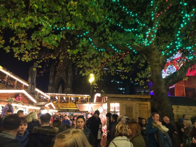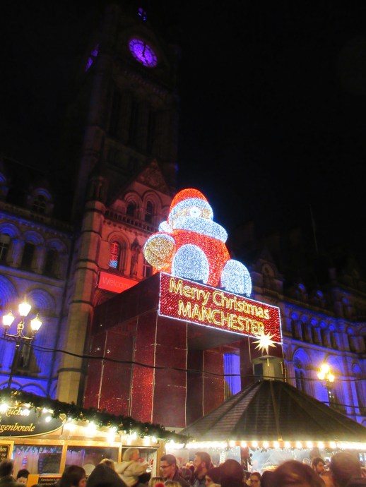 I couldn’t not wander up to Albert Square afterwards, and to my delight, I found an absolutely buzzing scene. A Christmas market, German style, as well as an extravagant Santa, perched on the front of the town hall. The entire square was rammed with people, and quite a large part was taken up with bars serving German beers. Outside you could get excellent German Wurst. A dream combination.