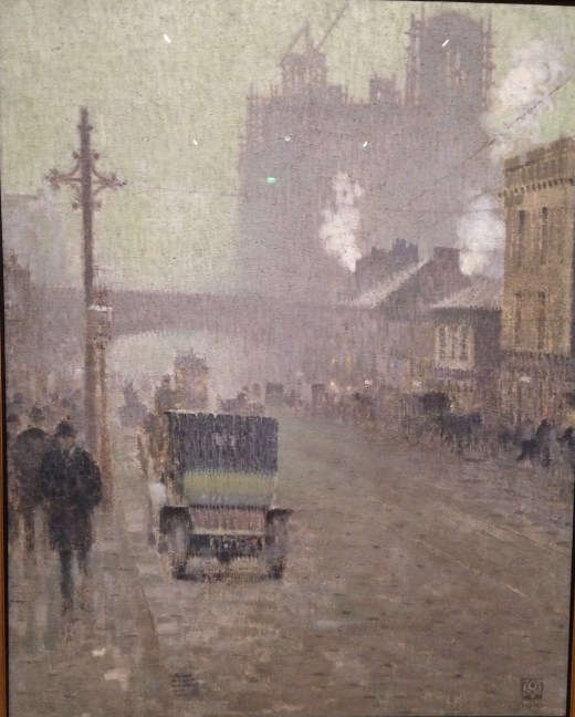 And on Sunday, after having a look round the University (last photo above is part of the Uni), I moved on to Manchester. The views from the train of the Pennine hills and the grey stone towns set into them were spectacular. In Manchester I took the opportunity to visit the Manchester Art gallery, where the highlight was the exhibition of Edwardian paintings. And the best of all, just like when I visited in March, were the Adolfe Vallette paintings of a Manchester in the early twentieth century tinged in fog – or smog. There were four in the exhibition. I find them entrancing and bathed in a kind of melancholy. I studied the technique. They are painted with oil on jute, or linen. They give the paintings texture, as well as absorbing the colour. I suspect this helps give the smog effect. Paradoxically they become clearer and brighter as you step further away. The opposite to real life.