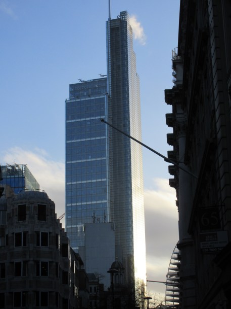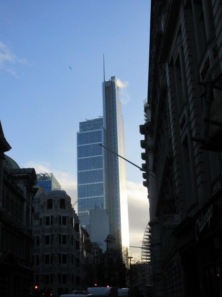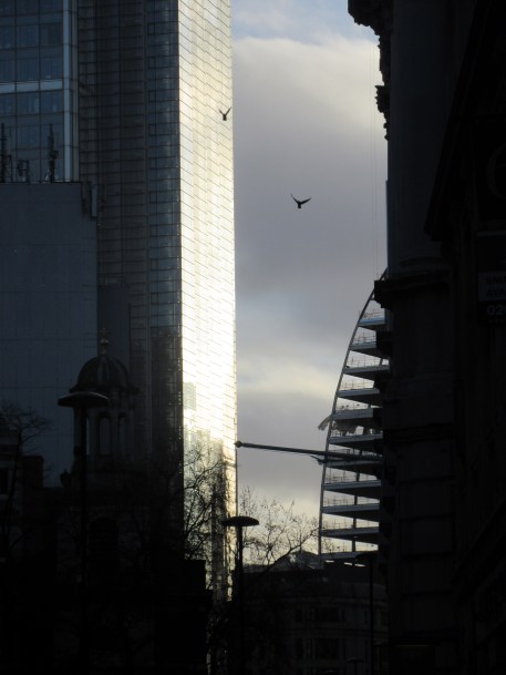 I took these shots the Friday before last. I was on London Wall, near the place I’m getting some physio for my back at the moment. The sun was shining through the clouds, and the side of the tower positively gleamed. The photos don’t quite capture what I was seeing, which was a gilded tower. But they give a hint. The works of man and nature combined in harmony for once.