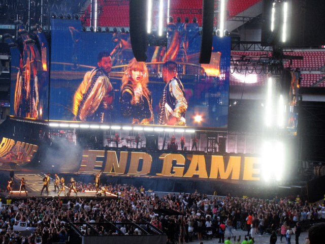 And then the build up to Taylor’s grand entrance. “Bad Reputation” by Joan Jett playing, and then the inevitable opener, “…Ready for It?”, first track on “Reputation”. That was followed by the defiant “I Did Something Bad” (which went down really well) and the gorgeous… “Gorgeous”. What a start! Songs from “Reputation” dominated the album, and they were greeted like old favourites. The set was pretty amazing at times, the costumes and screens ever changing, and there were a lot of snakes! Signifying something on Taylor’s mind, no doubt. Surrounded by them in the world of showbiz, I guess. There were two stages halfway down the pitch, as well as the main stage, and Taylor sang and danced on both in the course of the evening. She was transported in mid-air to and from them. There was a lot going on! She sang part of “Delicate” in a gilded cage suspended over the audience, after telling one of her heartfelt stories – no doubt the same every night, but done with sincerity. That was followed by perhaps the highlight of the show, with the most reaction from the crowd. “Shake it Off” of course, where she was joined by Charli XCX and Camila Cabello. No trick missed in this show.