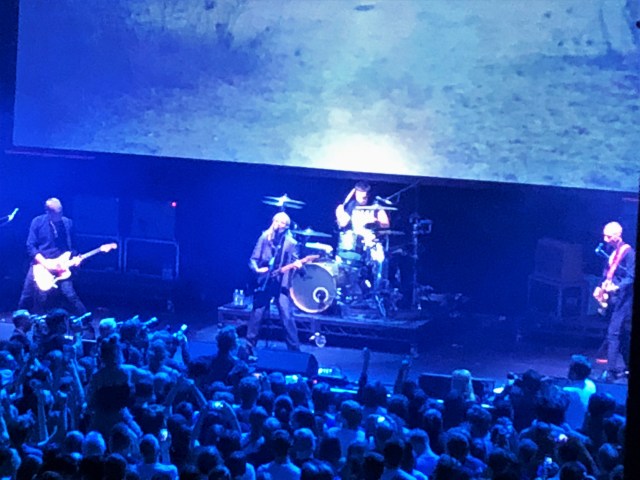 Idles as support had a fairly short set. They were shrouded in shadow a lot of the time, and the thing that stood out was the big screen with their name on it. They were their usual in-yer-face selves – one guitarist in his underwear, the other a throw back to the 70s, bassist straight out of ZZ Top, vocalist Adam Talbot declamatory. My favourite lines are still those in “Mother”, my favourite song: the best way to scare a Tory is to read and get rich! They are a great live band, no doubt. Dave thought their look was a bit mixed up. I said that was a good thing. They don’t conform to a uniform look. Punk but not punk.
