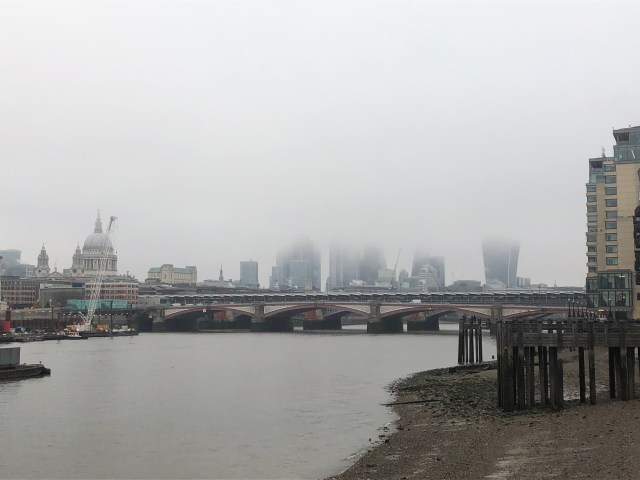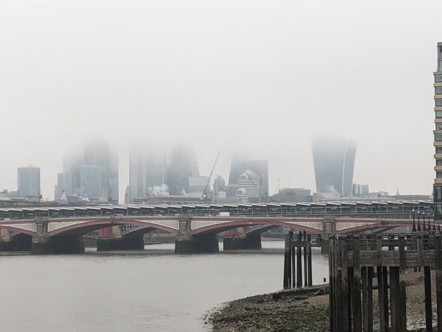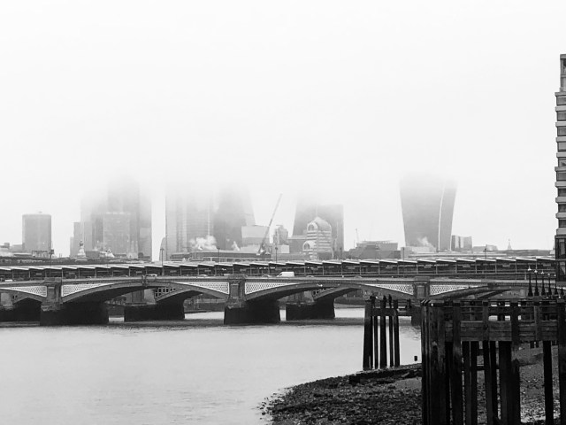 I was walking along the river yesterday lunch time, heading for the Tate Modern. I liked this scene near Blackfriars railway bridge, of the City caught in a low cloud or mist. St Paul’s stands aloof.