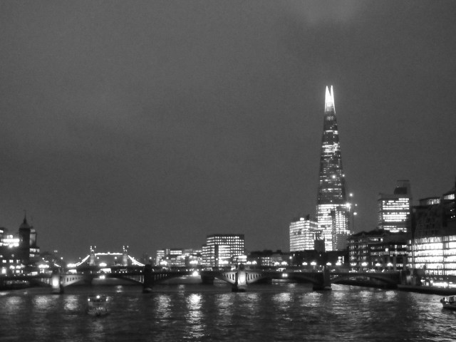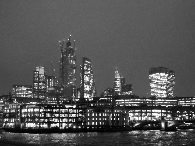 Yesterday I spent a few hours at the Tate Modern working on the follow up novel to “The Decision”. Afterwards, around 4.30, I walked over the Millenium Bridge en route to Mansion House tube station. The views of the City and other directions are stunning as darkness falls. I took a few shots – not for the first time – and have turned a few of them into black and white pictures. See what you think.