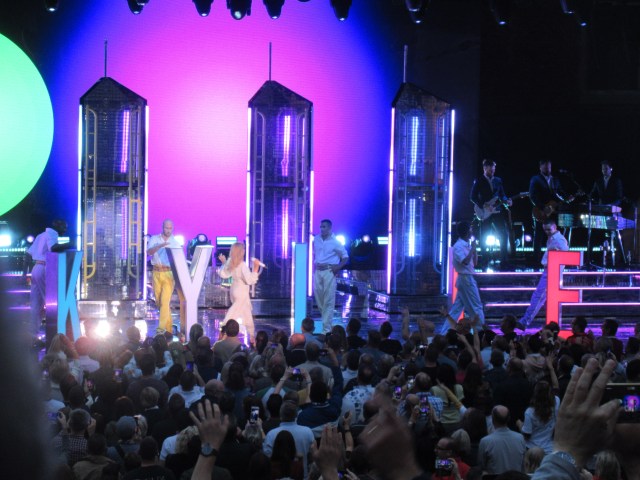 KYLIE! Our favourite Aussie pop star is back in Europe for a tour, which recently took in the Legends slot at Glastonbury, as British and Irish readers may have seen on the BBC. I still haven’t watched that show on the iPlayer, but I did see her back in June, when she played a couple of nights at Hampton Court Palace. It’s a lovely place for a concert, surrounded by the historic buildings and grounds. The place seems to glow as the sun goes down if the weather is kind, as it was when we went to see Kylie. We had the added benefit of drinks and dinner as part of a hospitality package, courtesy of my good friend Dave. All in the beautiful grounds, with the sun shining, and then the tapestry-walled halls that date back to the time of King Henry VIII. Not my normal preparation for a concert, which is usually a couple of pints in a nearby pub – except of course when we go to the Roundhouse, when a visit to the magnificent Sushi Salsa by Camden Lock is obligatory! We like a bit of luxury in our old age!