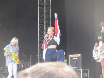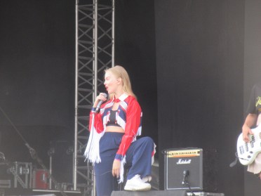 Dream Wife were on the Main Stage. That meant their effect was diluted a bit – the perennial problem of playing in the sunshine in mid-afternoon – but they did a good job of engaging the crowd and getting people to sing along to the choruses of songs like “Somebody”: I am not my body, I am somebody! Singer Rakel Mjoll was her usual ebullient self, and the riffs were sparky. I’d have preferred to see them in one of the tents, but, in fairness, they got to engage with a lot more people being on the Main Stage, and the reaction was enthusiastic. Good for future sales.