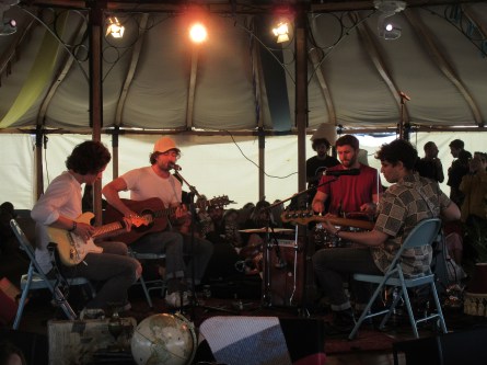 Then it was over to the DIY tent (aka the Big Top) for Squid. They have been creating a bit of a stir on 6 Music recently. The music is pretty bonkers – a mixture of riffing, noodly bits and a fair bit of screaming. Their song “Houseplants” is, in a bizarre way, really catchy. And the show confirmed all of these elements. The drummer, Ollie Judge, is also the main singer, though a couple of others do some semi-spoken bits. I guess if you wanted to categorise the sound, it’s an updated 80s post-punk. The spirit of the Fall and the Gang of Four is in there, but maybe Talking Heads too, especially lyrically. And they are there in with Pom Poko in spirit, amongst up-and-coming bands. I have to say the performance made me smile a lot, too. It combines the daft and the brilliant. What is really going on there, I don’t really know. But it is a hoot.