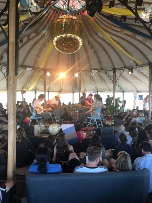 I’d had a fair bit of ear-bashing by this point, so thought I’d try out something a bit more mellow, in what had been the Sunday Papers Live tent, featuring comedy in an enclave in between the main stage and DIY tent. It was a Sofar Sounds production, featuring a band called Montrell. Sofar Sounds put on informal gigs around London in all sorts of different spaces. You can sign up to their mailing list and get wind of what is going on. I’ve not been to one yet, but friends who have been have loved them. The nature of the shows is that they are acoustic or electric with the sound kept at a subtle level. A bit like those guest appearances they have at the BBC base camp during Glastonbury. Montrell were just right for the vibe. Tuneful, a little bit jazzy, gently rolling beats. Perfect for chilling out. Interrupted at first by the excitement across the way in a bar with a TV showing the cricket, but it was a lovely way to wind down a little.