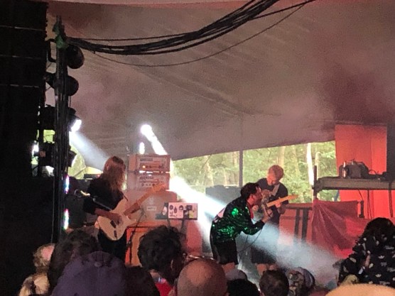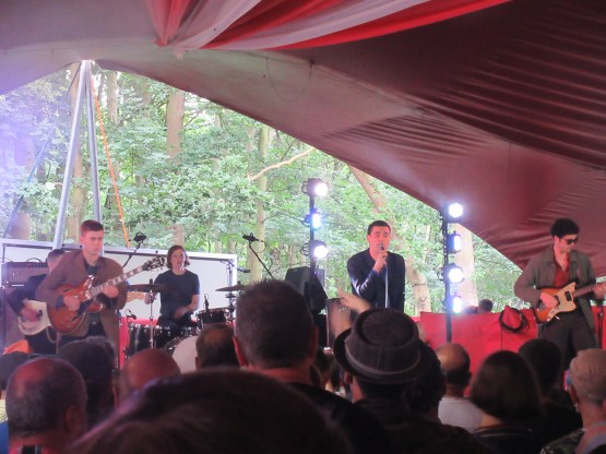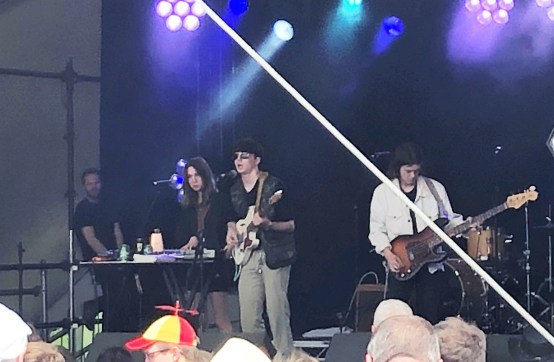 After that we wandered up to watch a band called Palace on the Obelisk. It was a lovely sunny day, after the mixed weather of Saturday, and the music of Palace chimed with the mood. Jaunty indie-pop, with chiming guitars and some nice solos. I heard elements of Two Door Cinema Club and Vampire Weekend in the sound, and thoroughly enjoyed it. Another band to explore further.  They were followed by a real discovery on the Lake stage. Both Louis and I were enthusing about a song called “Bad Blood” by Working Men’s Club. I’d heard it a few times on 6 Music. The Fall clearly an influence, but guitar motifs which were more out of the Only Ones’ or Strokes’ songbook. Live, the look and intonation of the singer Sydney Minskey-Sargeant was definitely Mark.E.Smith, but the music was extremely varied, some of it heavily electronic, some guitar thrash and one that had strong undertones of Joy Division. We were all pretty excited about this band. Looking forward to hearing more from them.