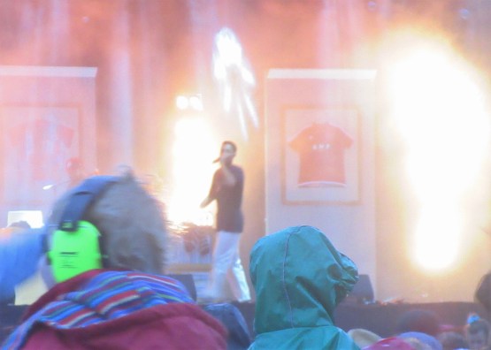It was early evening and getting a bit chilly, so I went back to get my jeans on, and a fleece. I got back to the Obelisk to catch the last few songs of Loyle Carner. As I arrived he started up “Loose Ends”, a recent single which I really like. Jon and I saw him in the afternoon at Field Day a few years ago, and it was a bit repetitive. He’s much slicker now, and really had the big crowd on his side. The youth were out in force for him, including the young kids, many of whom bounced up and down on parents’ shoulders. Made getting a decent photo impossible, but it was a lovely atmosphere, even in the rain which had crept in. Like Stormzy at Glastonbury, he declared it the greatest moment of his life. He finished with one of his first ever songs, “No CDs”, harking back to the days when it was a struggle to get anyone to listen. A touching moment in a triumphant performance.