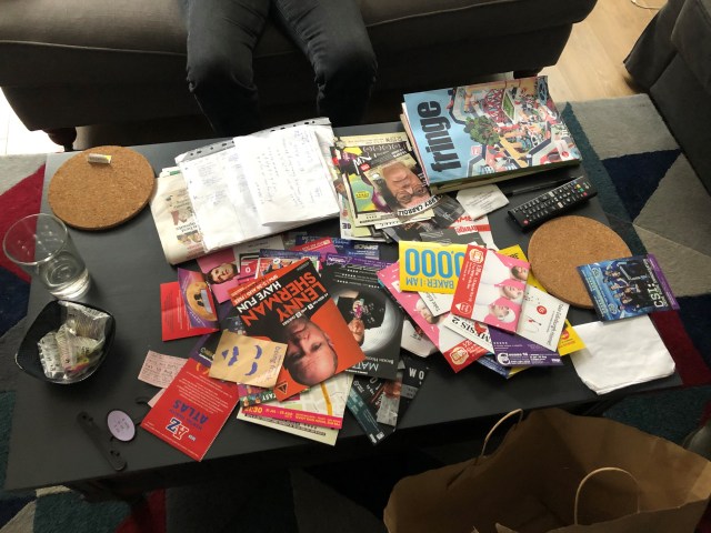 I’m just back from a few days at the Edinburgh festival. What an amazing event it is – a huge and diverse celebration of the arts. In the five days I was there I could only scratch the surface of what was on offer; but as ever it was funny, inspiring, moving, thought-provoking – and occasionally excruciating. We picked a few of our shows in advance from the mind-bogglingly large Fringe events programme, but just as much we relied on spur-of-the-moment decisions, aided by the excellent Fringe app and the multitude of flyers being handed out in the street and in the bars by enthusiastic young folk and, quite often, by the artists themselves.