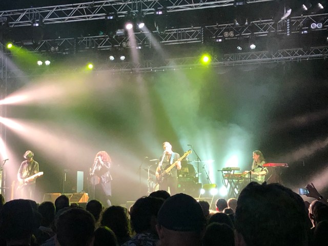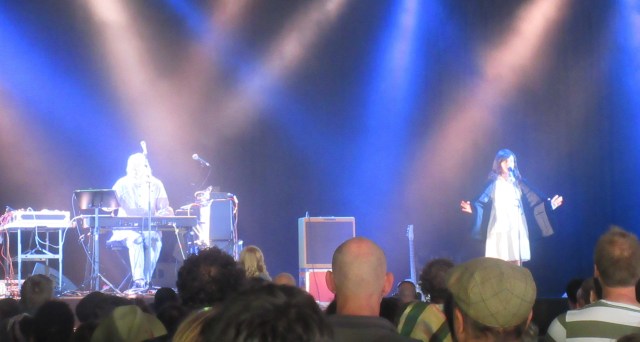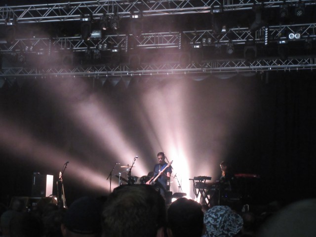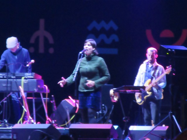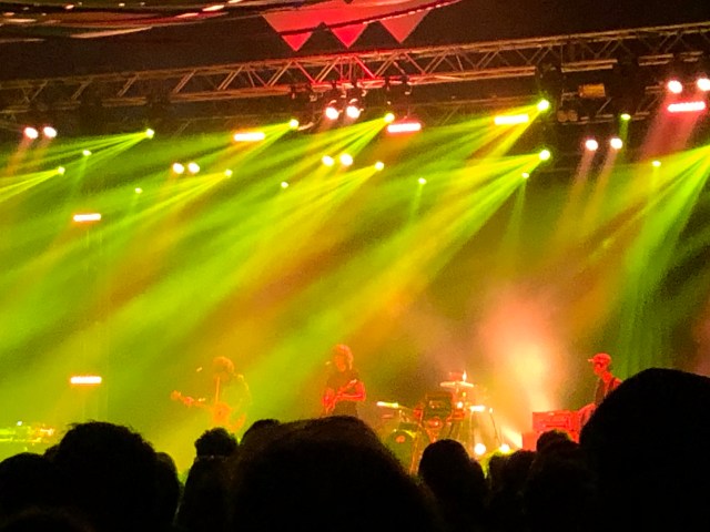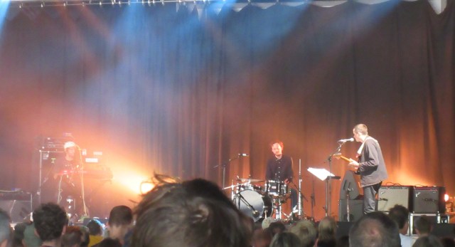 Next on the Mountain Stage were Stereolab. I used to like their mix of electronics, Latin beats and French crooning – courtesy of singer Laetitia Sadier – in the 1990s. “Dots and Loops” (1997) was my favourite album and “Brakhage” my favourite song, so I was delighted they started with that. They played it faster than the recorded version, and that was a theme of their performance: faster and rockier. It worked well as darkness fell. A captivating show.