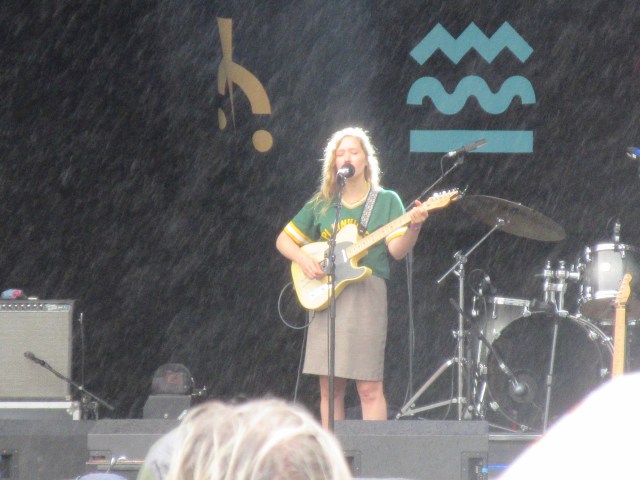 There was no escape now from the rain out at the Mountain Stage, for three unmissable acts. First was Julia Jacklin, whose album “Crushing” is one of my favourites of the year. It’s an album of subdued beauty, reflecting a stage in Julia’s life when she had broken up with her long term boyfriend. There’s a theme about her body and how she’s reclaiming it that runs through a lot of the songs, including the album and set opener, “Body”. It’s a powerful song, but a slow burner, and didn’t exactly get the crowd going in the rain. There were more upbeat moments (musically if not lyrically) like “Pool Party”, “Red Light” and “Pressure to Party”; but for me the highlight was three wonderful songs in the middle of the set: the aching blues of “Don’t Know How to Keep Loving You”, the anguish of “Turn Me Down” and the heartfelt paean to family, “Don’t Let the Kids Win”. Wonderful and moving. Tears in the rain.