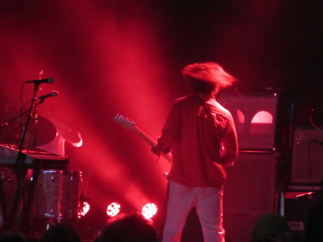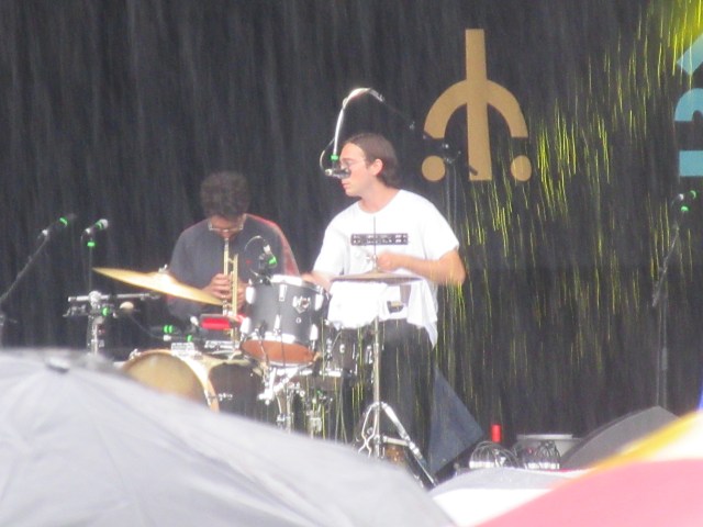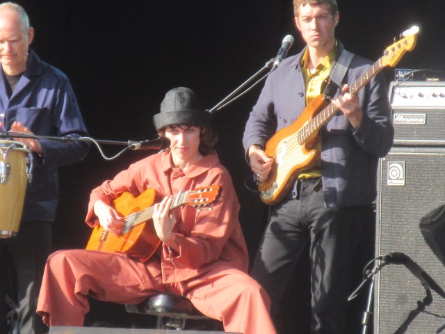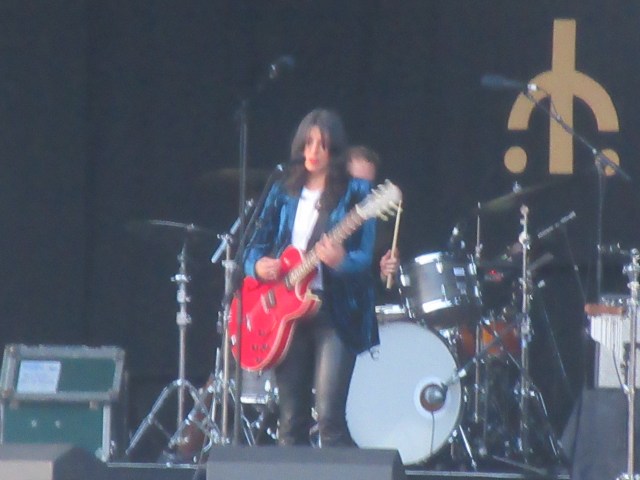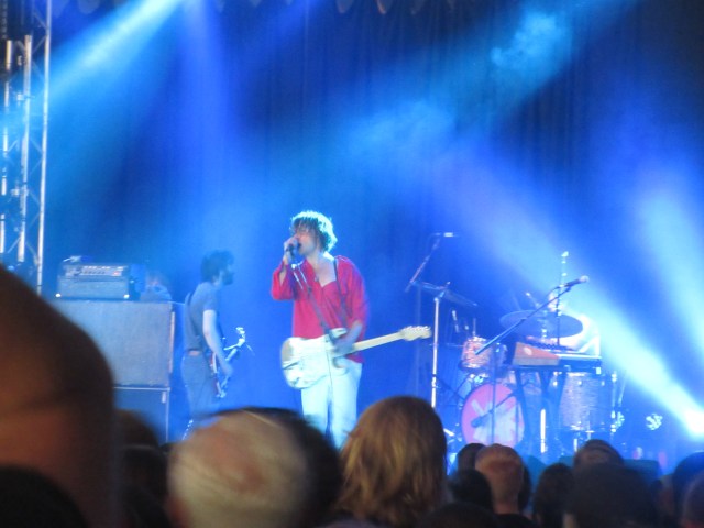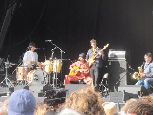 I popped over next to catch a bit of Molly Payton at the Rising Stage. Electric guitar and a strident voice: I was reminded a little of Julienne Baker in recent times and Patti Smith from further back. I’ll be interested to hear her recorded work. Then it was back to the Mountain Stage for Whitney. What a joyful, uplifting sound they make! A beacon of brightness in the rainy gloom. They played a fair bit of new material from the forthcoming album, and it sounded good. Continuing in that crisp, melodic vein which reminds me of early Van Morrison. Julian Erlich was his usual ebullient self, centre stage on the drums, singing in his effortless falsetto. And, third last song, the Whitney anthem, “No Woman”. Everyone singing along in the rain. One of the festival highlights.