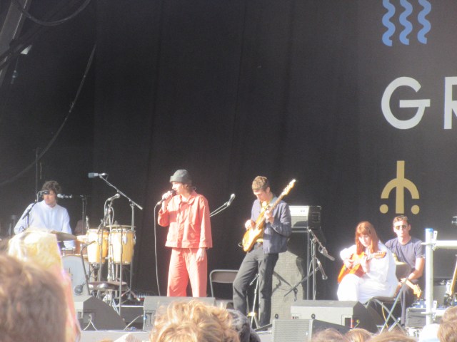 Inevitably, with the weather so nice, the first two bands we saw were in the Far Out tent! Modern Nature is an offshoot of a band called Ultimate Painting, whom Jon was very keen on. The vehicle of Jack Cooper, the band’s music has a subdued darkness which erupts into forceful beats and guitar outbursts from time to time. There’s some eerie sax too, and I was reminded of Joy Division, Low and even early Roxy Music. Think of the amazing “Ladytron” as an example of the latter. The discovery of the festival for me.  They were followed by the intriguing Jockstrap. Terrible name – unless it is meant to be. And I think it probably is. I’d heard a couple of the band’s songs, which were the ones with a bit of a 60s film music and samba feel. Live there were all sorts of things going on, led by singer and violinist Georgia Ellery and keyboard player Taylor Skye. Bright leisure wear was the order of the day, with Georgia wearing one of Barcelona’s lurid orange tracksuit tops when she came on. This was dots and loops music – essentially electronic, though you never knew what was going to pop up next. There were flutes, cowbells, violins, jumpy guitars. Georgia’s vocals were a series of intermittent squeaks and shrieks. The band struck me as accomplished musicians having a bit of fun; and on reading about them I see that they went to Guildhall School of Music. I’ll be interested to hear an album’s worth of their music – a 10cc or Stereolab for our times, perhaps.