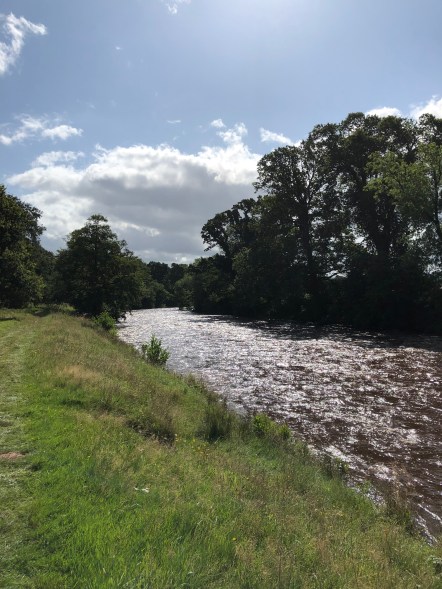 A lovely and rain-free day. I’m not naturally an early riser, but the combination of the heat inside the tent when the sun shines, the increasing noise and the desire to avoid the queue for a shower meant I was up by 7.30 every day. Jon and I decided to make the most of the weather and the beauty of the surrounding countryside by going for a walk along the River Usk, in the direction of Crickhowell. An unusual and enjoyable experience at a music festival. All of our festivals  are in lovely settings, but I think Green Man has to take first prize, with the looming Black Mountains in the background. There are a few photos at the end of the blog.
