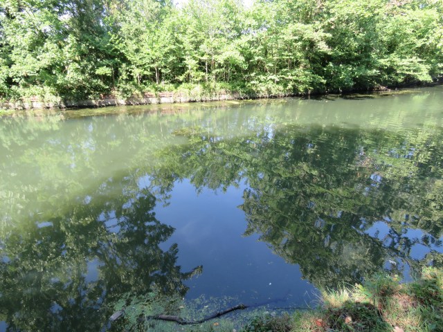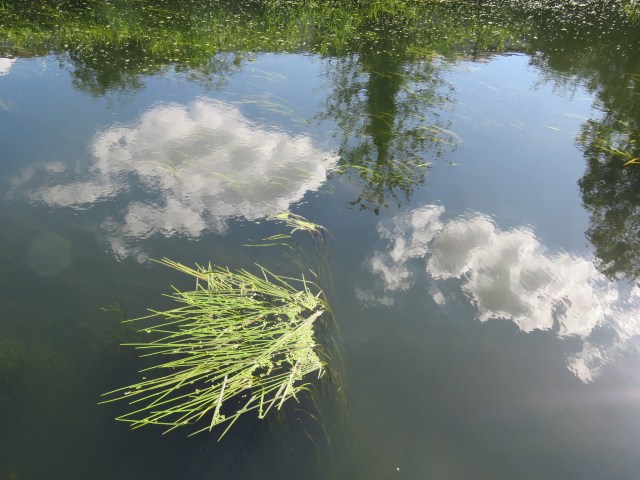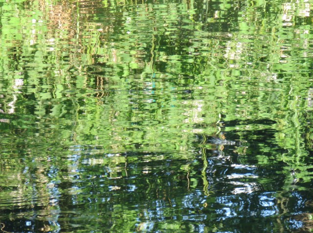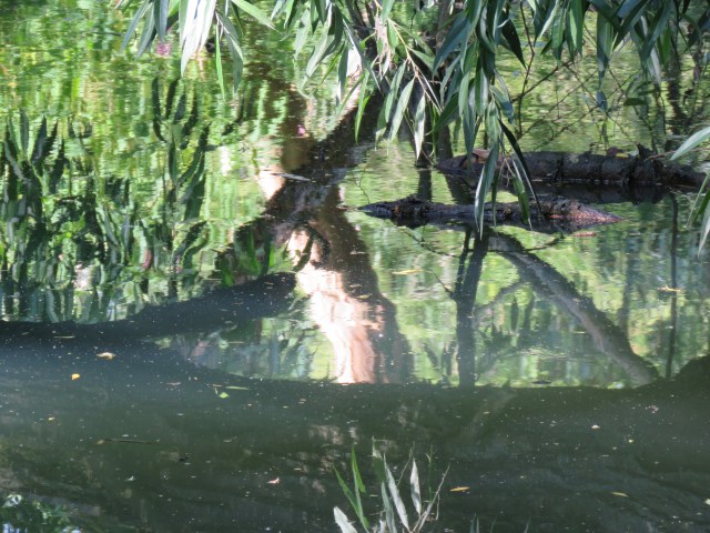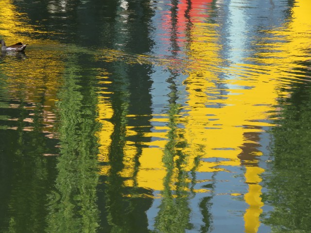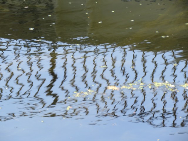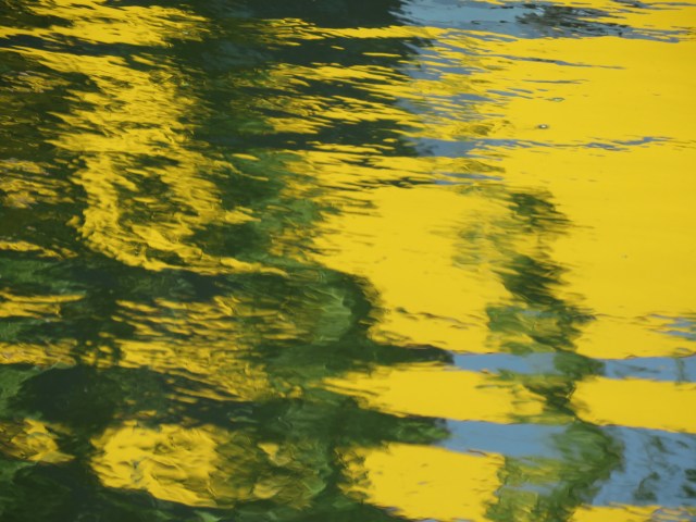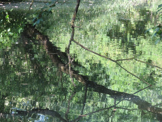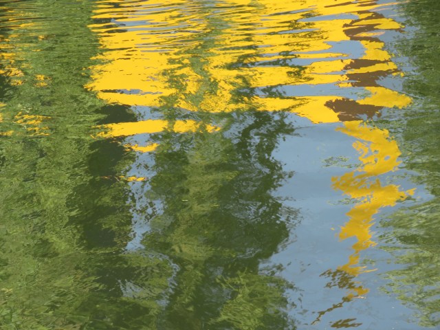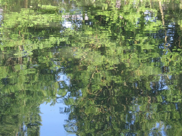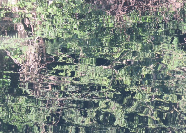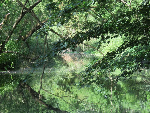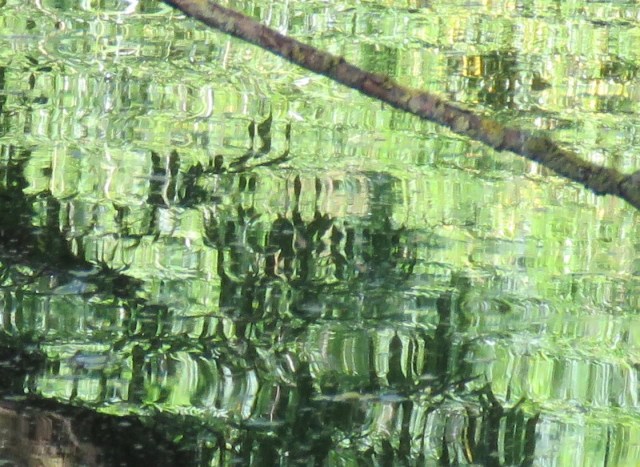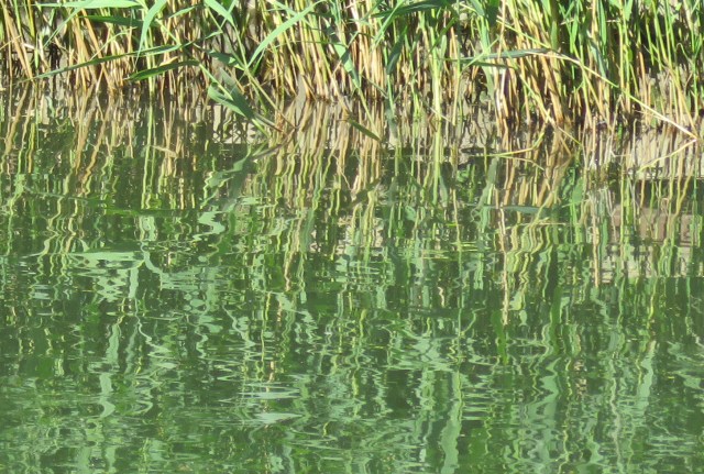 When the sun shines, the surface of the water responds, mirroring the objects and scenes above and alongside. And as it ripples and flows it distorts those images. And if you zoom in with your camera you find images that could be straight out of an abstract or impressionist painting. The place that really brought that home to me in late May was where a brief offshoot of the canal rejoins the main body of water. It’s overgrown and is home to an array of wildlife. And once the camera does its tricks, it’s a work of art…