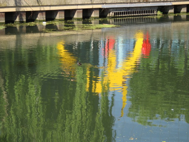 For the last couple of months I’ve spent a lot of time walking along the nearby Grand Union Canal and from time to time along the River Thames too. I’ve been absorbing the beauty of the natural world – the steady flow of the canal, the faster rush of the tidal river; the vibrant greens of the vegetation, the striking pinks and purples and yellows of the flowers; the daily life of the swans and ducks and moorhens, as they bring new generations into the world. I’ve taken a lot of photos, and thought I’d share a few with you. Starting with a place where nature meets art: reflections.