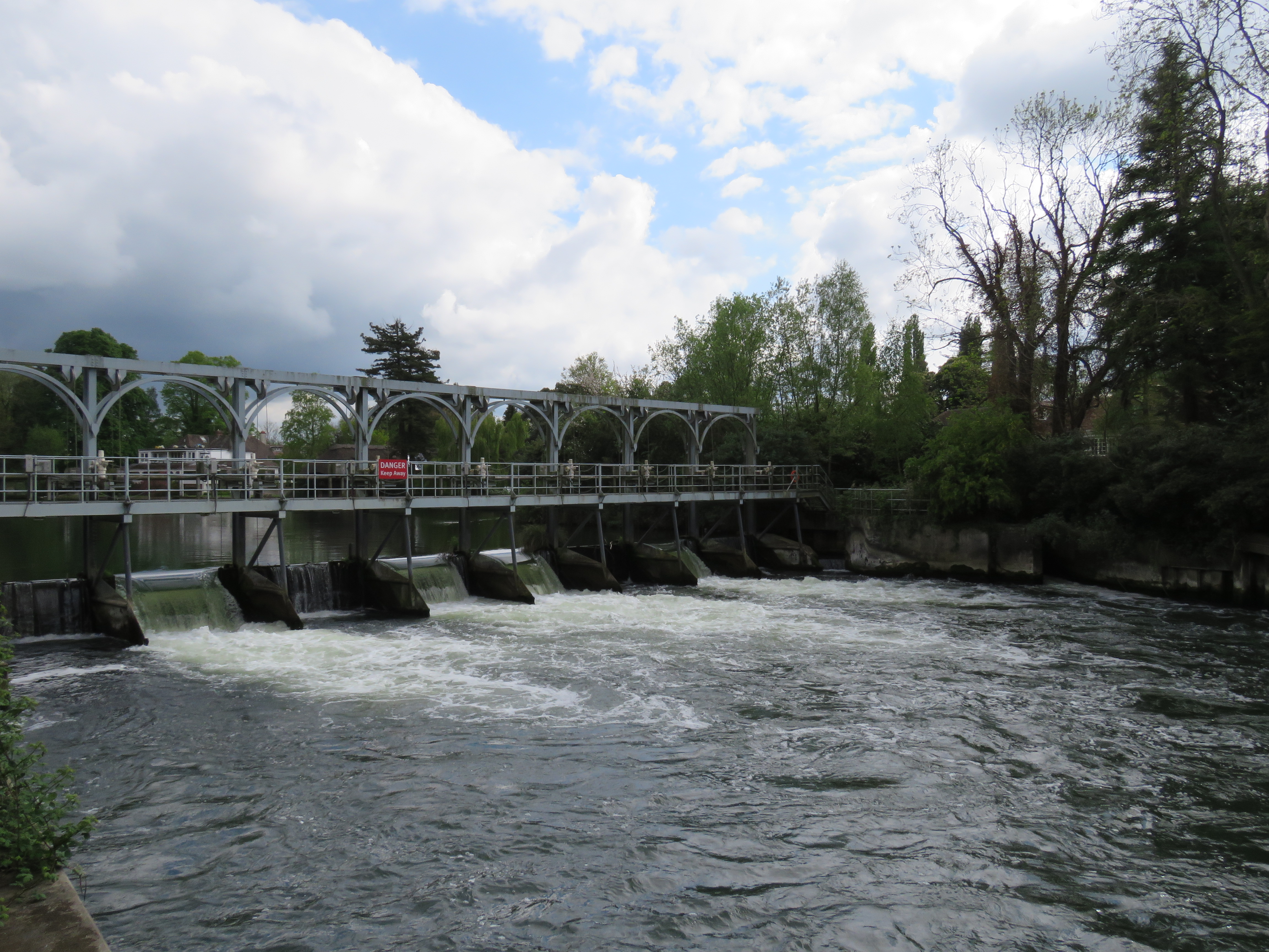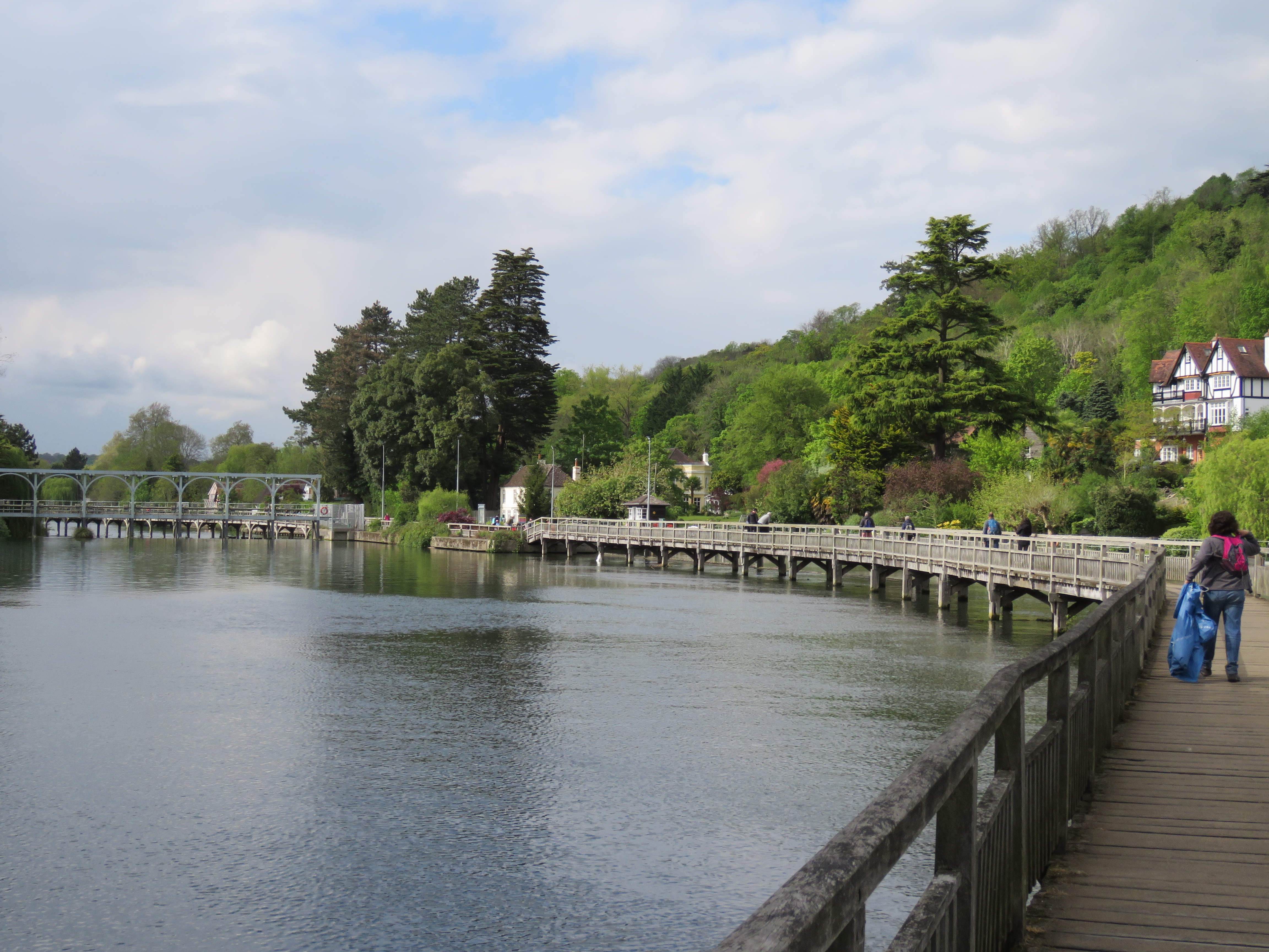 We descended into Whitchurch. The iron bridge there, painted white, was opened in 1902, and is one of two remaining toll bridges on the Thames. The other is Swinford Bridge, which featured in part three of this journey. Pedestrians have been able to cross the bridge for free since decimalisation in 1971; for vehicles the cost is 20p! We crossed over into Pangbourne, named after the River Pang, which joins the Thames at this point. Pangbourne is today best known for being the home of Kenneth Grahame, author of The Wind in the Willows, for the last eight years of his life (he died in 1932). The adventures are inspired the river in this part of the world. A little further downriver, Mapledurham House is thought to be the model for Toad Hall. I knew nothing about this when we walked this stretch, so all I have is a photo of Mapledurham Lock!