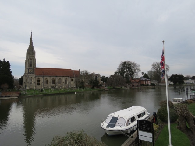 I wrote about the bridge at Marlow in part five of the journey, but not All Saints Church, which nestles by the river. From the towpath side you get a good view of the church. The current building is a Victorian construction, completed in 1835. The old church dated from the 11th century, but it was undermined by centuries of flooding. The spire collapsed in 1831!