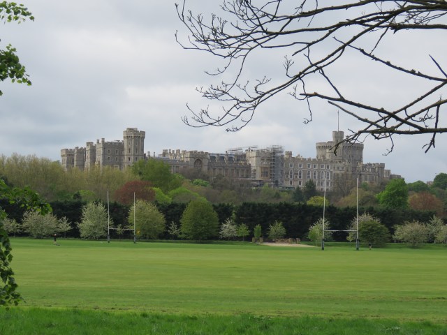 This was a longer stretch – 11 miles plus, downstream. We began from Windsor station, and were soon walking along the Home Park. Windsor Castle loomed in the background. The Queen’s residence, and an impressive sight. William the Conqueror built a castle on the knoll of chalk that rises here. Peter Ackroyd speculates that, being artificial, it may have prehistoric origins. William’s castle was rebuilt by King Edward III between 1360 and 1374. Hundreds of local men were “impressed” to do the building, against their will. Slave labour, basically.