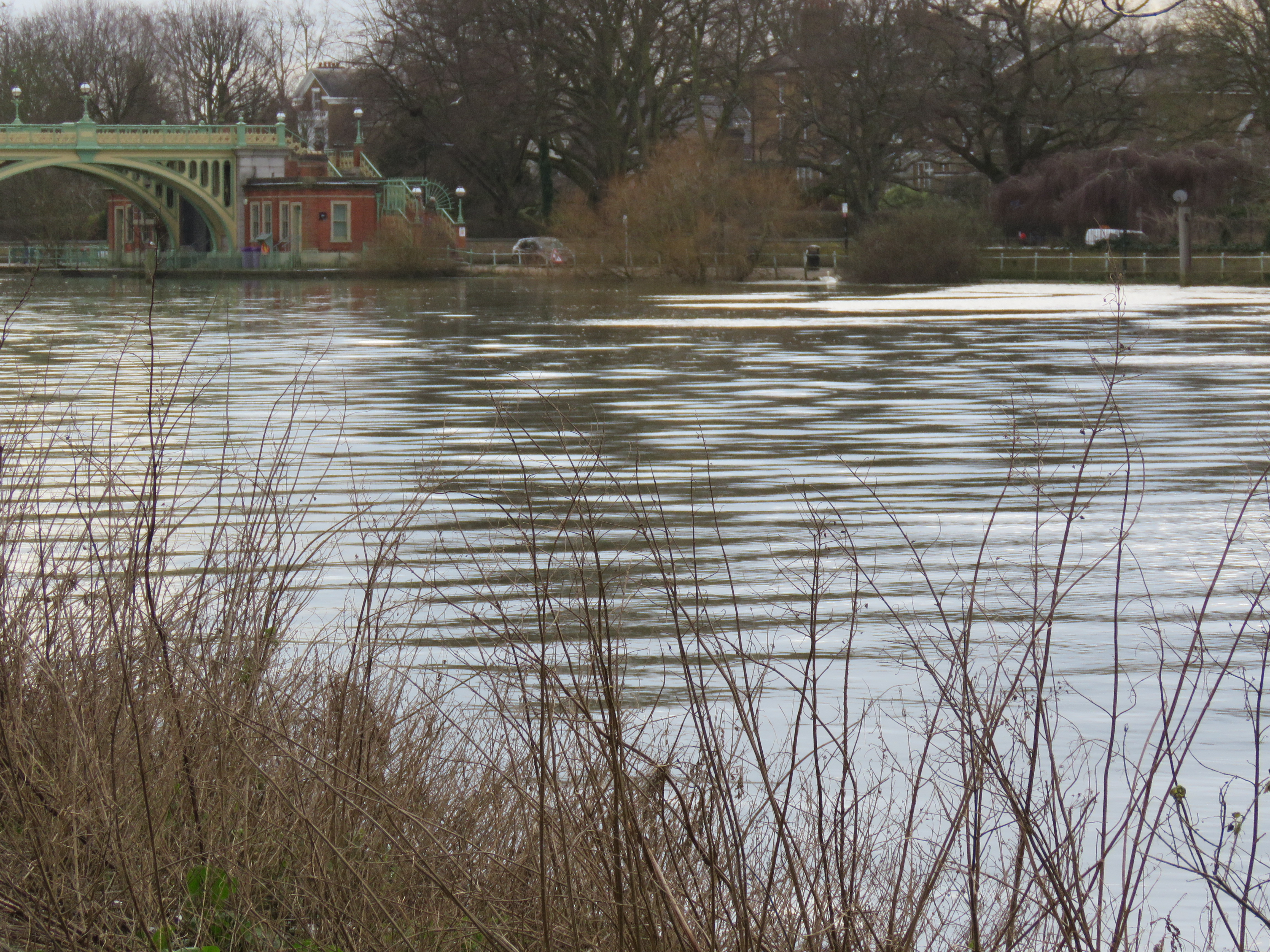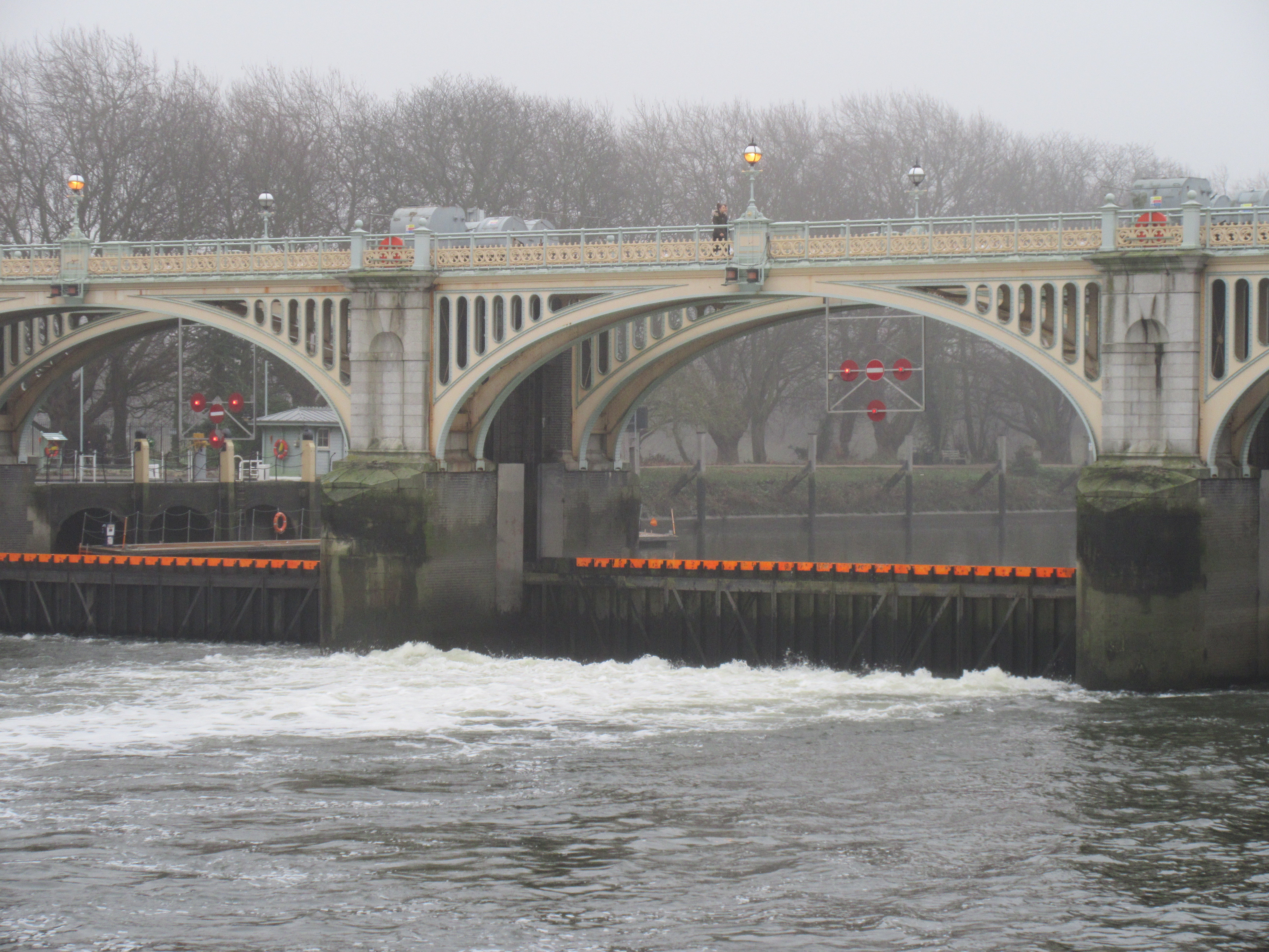 The main purpose of Richmond Lock was to regulate the tidal flow so that the stretch of the river between between Richmond and Molesey (near Hampton Court) wasn’t impassable to boats at low tide. Too much of the water drained away downstream, so three large sluice gates at Richmond Lock prevent all of the water making its passage to the sea. Whether that also contributes to the flooding in Richmond at high tide, I don’t know. But it seems a possibility.