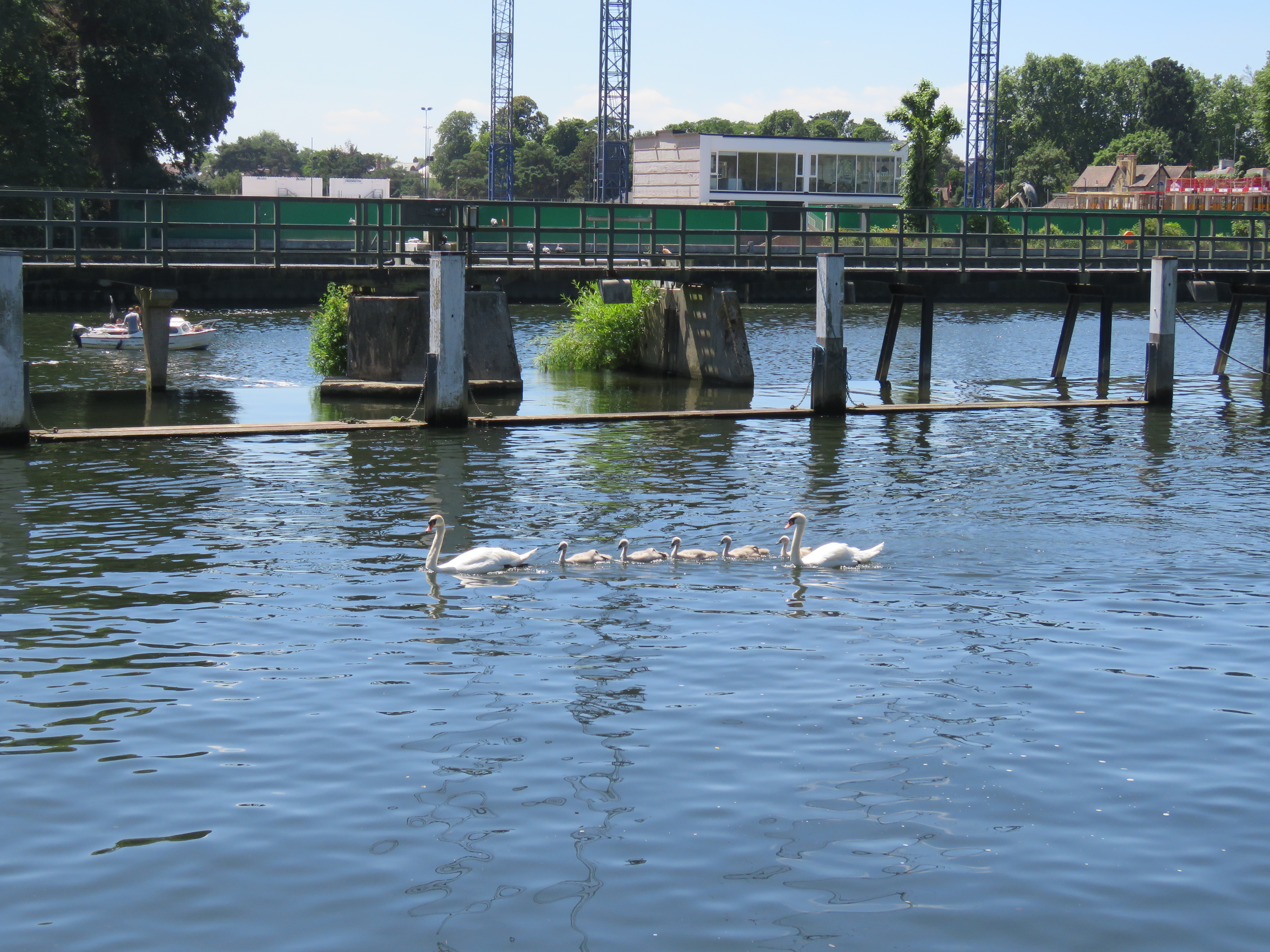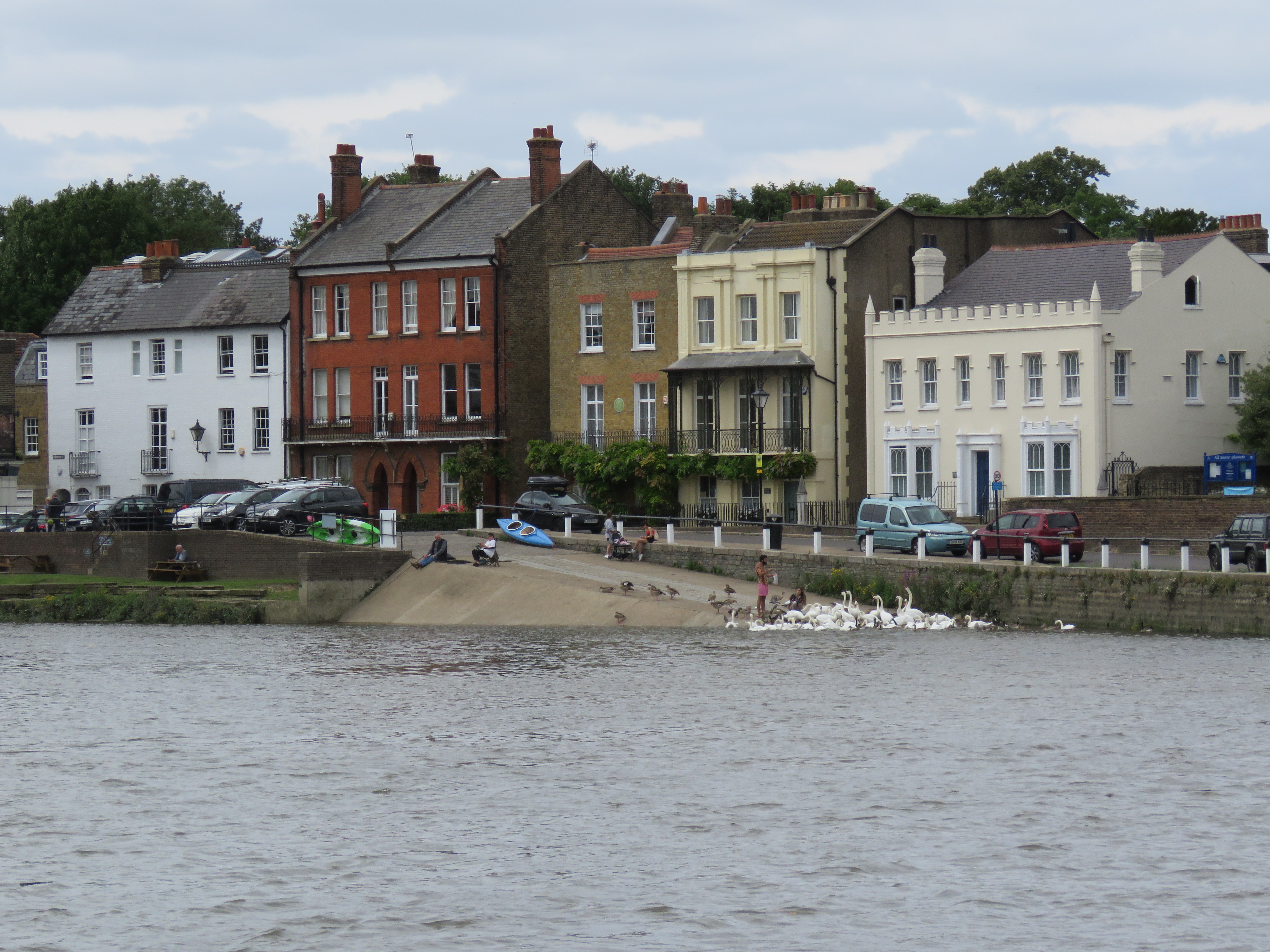 Across the river, Isleworth and then Syon Park come into view. Isleworth in general is unremarkable, but the old village, down by the river, is rather lovely. Much of the riverside is obscured by the woods on Isleworth Ait, but they relent just as the London Apprentice pub and All Saints church make their appearance. The pub is over 500 years old. Its name comes from the times when apprentices rowed up the river from the City on their annual day off. One day a year! Turner lived nearby in his thirties and was a regular. In our Quins-going days, and once we no longer needed to take the kids by car, Jon and I liked to walk to the Stoop via the London Apprentice, where we’d have a pint and watch some of the lunchtime football on the TV. The tower of All Saints dates from the 15th century; the rest of the building is modern. The waterfront here has the largest gathering of swans I have seen on the river. It’s a popular spot with families and young couples, especially at low tide, when they can walk onto the river bed to feed the birds. At high tide, on the other hand, the road can become impassable, as the river laps up against the garden walls of the church.
