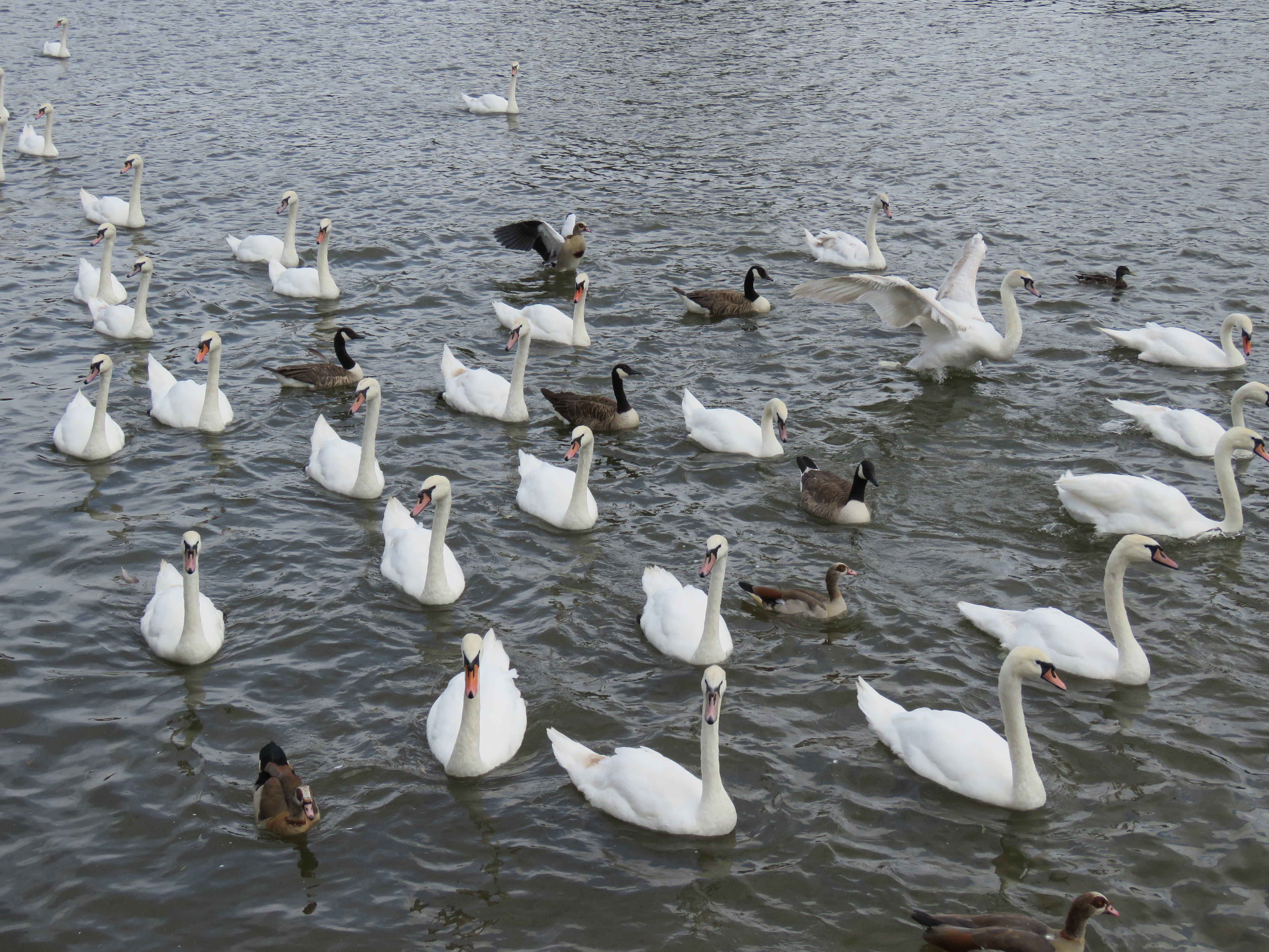 The next couple of photos are from February this year. I liked the way the water’s surface had a black and white effect as it rippled at high tide and reflected the low sun. There’s a bench I often sit at by the footbridge on the Surrey side. I get out my flask of tea and sandwiches – how old geezer is that? Still, the option of popping into the pub has been lost to us for most of the past year. Anyway, one of the swans in the photo got pretty interested in what I was eating and came close. I thought taking a snap right at that point might be ill-advised!