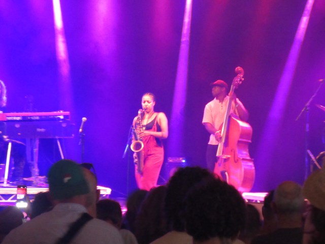 A pleasant interlude, but it was time to shake off the summer torpor. We had planned to stay on for the Kaiser Chiefs, but it was a 45 minute wait, by which time we would probably have zoned out altogether. Also, the Kaisers would eat into Nubya Garcia’s set, and she was essential viewing. So we decided to forgo the delights of I Predict a Riot and Ruby and take a punt on Liz Lawrence at the Alcove. It was a good call. She has a lively indie-pop style which makes you want to move your feet. The Alcove wasn’t full, but the crowd was incredibly enthusiastic – she has a loyal following. It was an upbeat half an hour which primed us for this year’s final straight, starting with Nubya Garcia at the BBC tent. Nubya is an amazing saxophonist and a central figure in London’s new jazz scene. She had a successful lockdown, releasing her debut album Source, which is an essential listen, exploring not only jazz, but her musical roots – the influence of reggae and African sounds is very evident. The show was an absolute dream, taking you to a higher place. Her sax-playing is exquisite and she had a superb band backing her, including Joe Armon-Jones on keyboards. Joe had headlined in his own right at the Alcove on Saturday. This was a pure indulgence of a show, a real joy.